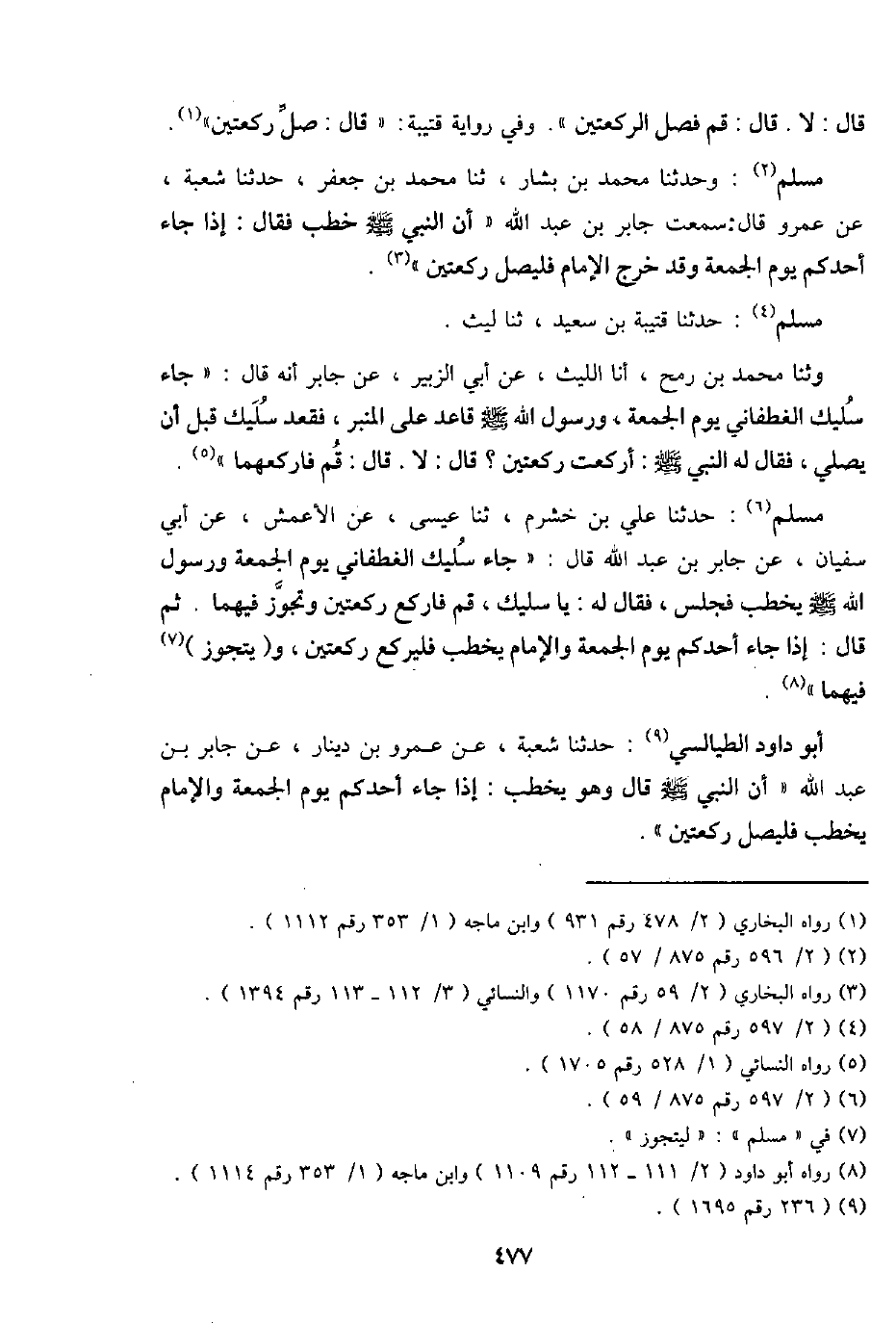 مُسلم: حَدثنَا عَليّ بن خشرم، ثَنَا عِيسَى، عَن الْأَعْمَش، عَن أبي سُفْيَان، عَن جَابر بن عبد الله قَالَ: " جَاءَ سليك الْغَطَفَانِي يَوْم الْجُمُعَة وَرَسُول الله - صَلَّى اللَّهُ عَلَيْهِ وَسَلَّم َ - يخْطب فَجَلَسَ، فَقَالَ لَهُ: يَا سليك، قُم فاركع رَكْعَتَيْنِ وَتجوز فيهمَا. ثمَّ قَالَ: إِذا جَاءَ أحدكُم يَوْم الْجُمُعَة وَالْإِمَام يخْطب فليركع رَكْعَتَيْنِ، و (يتجوز) فيهمَا ".