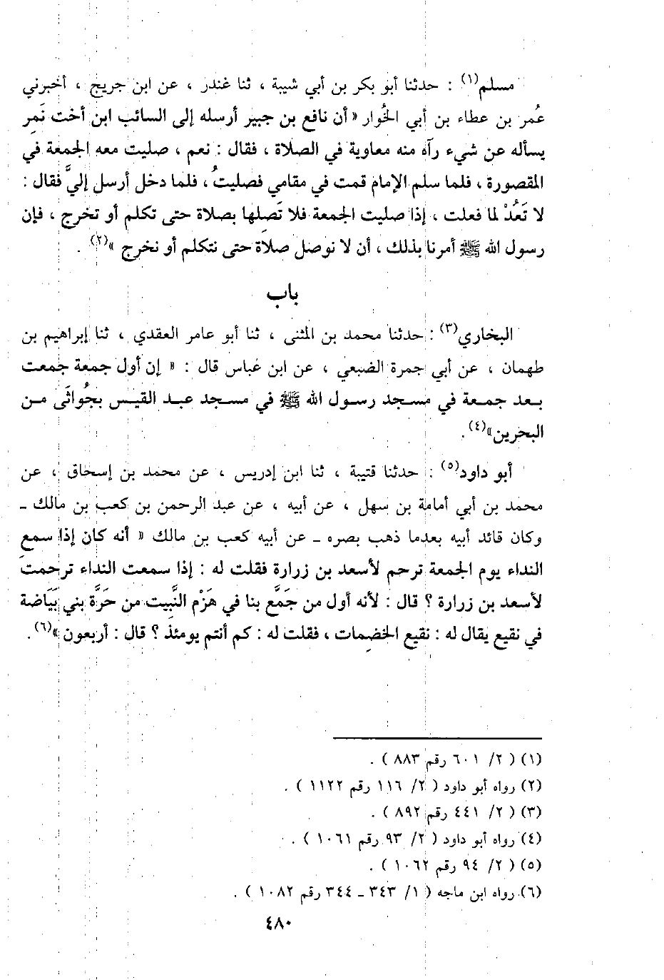 مُسلم: حَدثنَا أَبُو بكر بن أبي شيبَة، ثَنَا غنْدر، عَن ابْن جريج، أَخْبرنِي عمر بن عَطاء بن أبي الخوار " أَن نَافِع بن جُبَير أرْسلهُ إِلَى السَّائِب ابْن أُخْت نمر يسْأَله عَن شَيْء رَآهُ مِنْهُ مُعَاوِيَة فِي الصَّلَاة، فَقَالَ: نعم، صليت مَعَه الْجُمُعَة فِي الْمَقْصُورَة، فَلَمَّا سلم الإِمَام قُمْت فِي مقَامي فَصليت، فَلَمَّا دخل أرسل إِلَيّ فَقَالَ: لَا تعد لما فعلت، إِذا صليت الْجُمُعَة فَلَا تصلها بِصَلَاة حَتَّى تكلم أَو تخرج، فَإِن رَسُول الله - صَلَّى اللَّهُ عَلَيْهِ وَسَلَّم َ - أمرنَا بذلك، أَن لَا نوصل صَلَاة حَتَّى نتكلم أَو نخرج ".