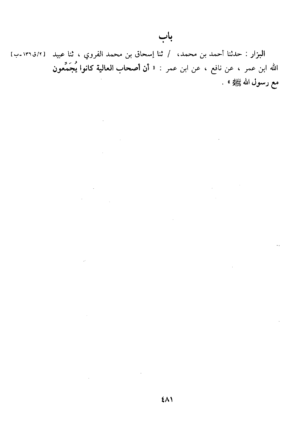 الْبَزَّار: حَدثنَا أَحْمد بن مُحَمَّد، / ثَنَا إِسْحَاق بن مُحَمَّد الْفَروِي، ثَنَا عبيد الله ابْن عمر، عَن نَافِع، عَن ابْن عمر: " أَن أَصْحَاب الْعَالِيَة كَانُوا يجمعُونَ مَعَ رَسُول الله - صَلَّى اللَّهُ عَلَيْهِ وَسَلَّم َ - ".