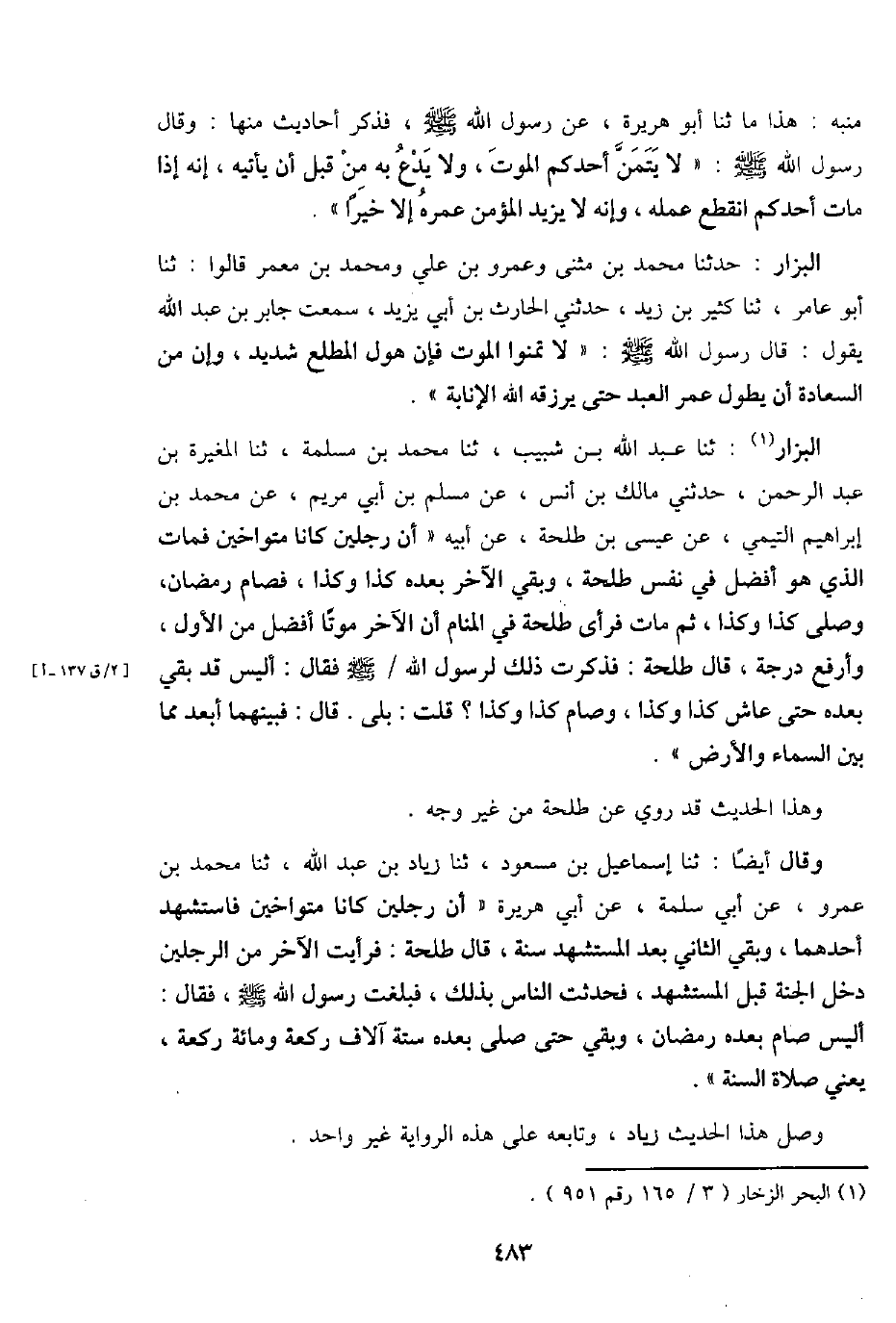 الْبَزَّار: ثَنَا عبد الله بن شبيب، ثَنَا مُحَمَّد بن مسلمة، ثَنَا الْمُغيرَة بن عبد الرَّحْمَن، حَدثنِي مَالك بن أنس، عَن مُسلم بن أبي مَرْيَم، عَن مُحَمَّد بن إِبْرَاهِيم التَّيْمِيّ، عَن عِيسَى بن طَلْحَة، عَن أَبِيه " أَن رجلَيْنِ كَانَا متواخين فَمَاتَ الَّذِي هُوَ أفضل فِي نفس طَلْحَة، وَبَقِي الآخر بعده كَذَا وَكَذَا، فصَام رَمَضَان، وَصلى كَذَا وَكَذَا، ثمَّ مَاتَ فَرَأى طَلْحَة فِي الْمَنَام أَن الآخر موتا أفضل من الأول، وَأَرْفَع دَرَجَة، قَالَ طَلْحَة: فَذكرت ذَلِك لرَسُول الله / - صَلَّى اللَّهُ عَلَيْهِ وَسَلَّم َ - فَقَالَ: أَلَيْسَ قد بَقِي بعده حَتَّى عَاشَ كَذَا وَكَذَا، وَصَامَ كَذَا وَكَذَا؟ قلت: بلَى. قَالَ: فبينهما أبعد مِمَّا بَين السَّمَاء وَالْأَرْض ".