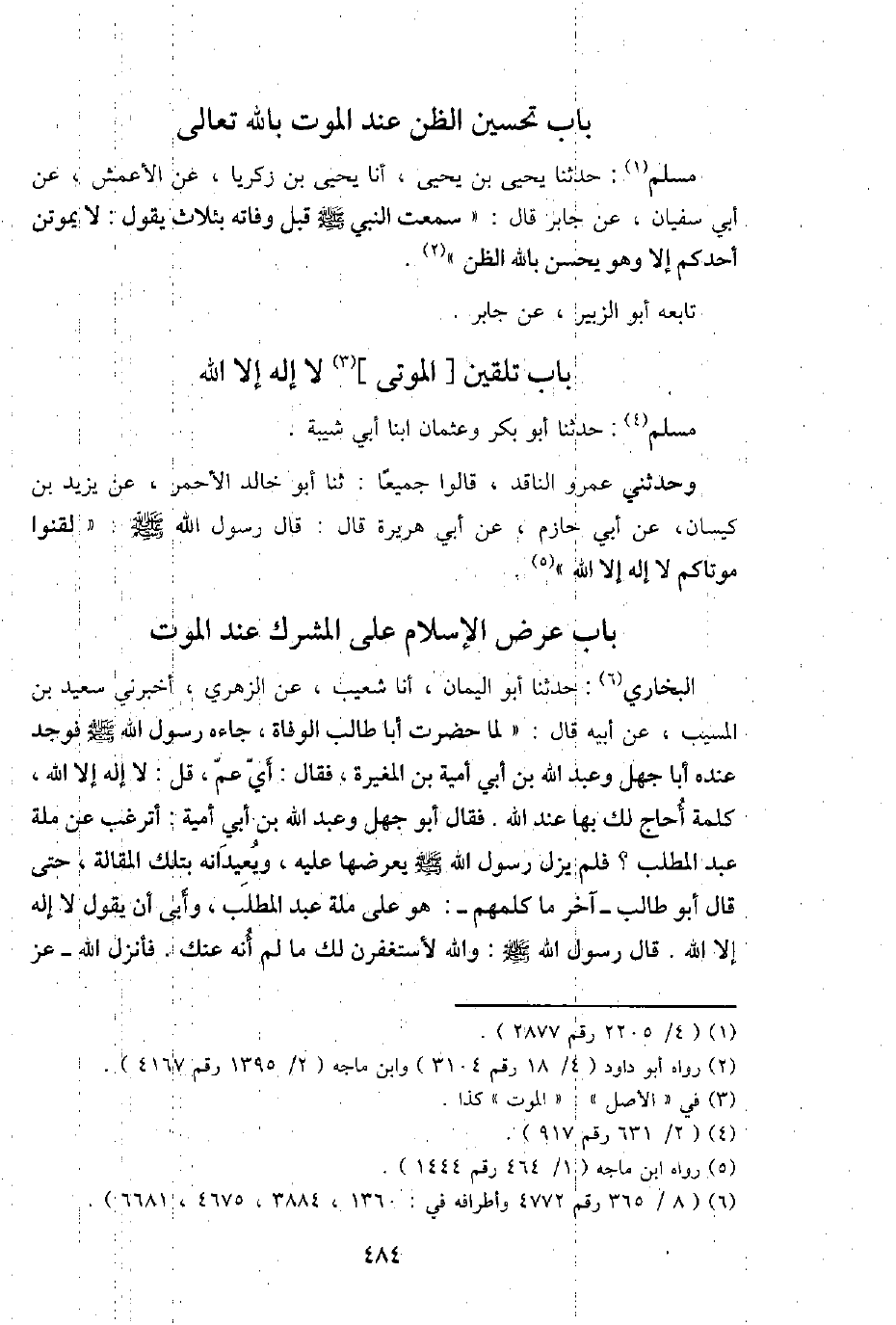 مُسلم: حَدثنَا يحيى بن يحيى، أَنا يحيى بن زَكَرِيَّا، عَن الْأَعْمَش، عَن أبي سُفْيَان، عَن جَابر قَالَ: " سَمِعت النَّبِي - صَلَّى اللَّهُ عَلَيْهِ وَسَلَّم َ - قبل وَفَاته بِثَلَاث يَقُول: لَا يموتن أحدكُم إِلَّا وَهُوَ يحسن بِاللَّه الظَّن ".