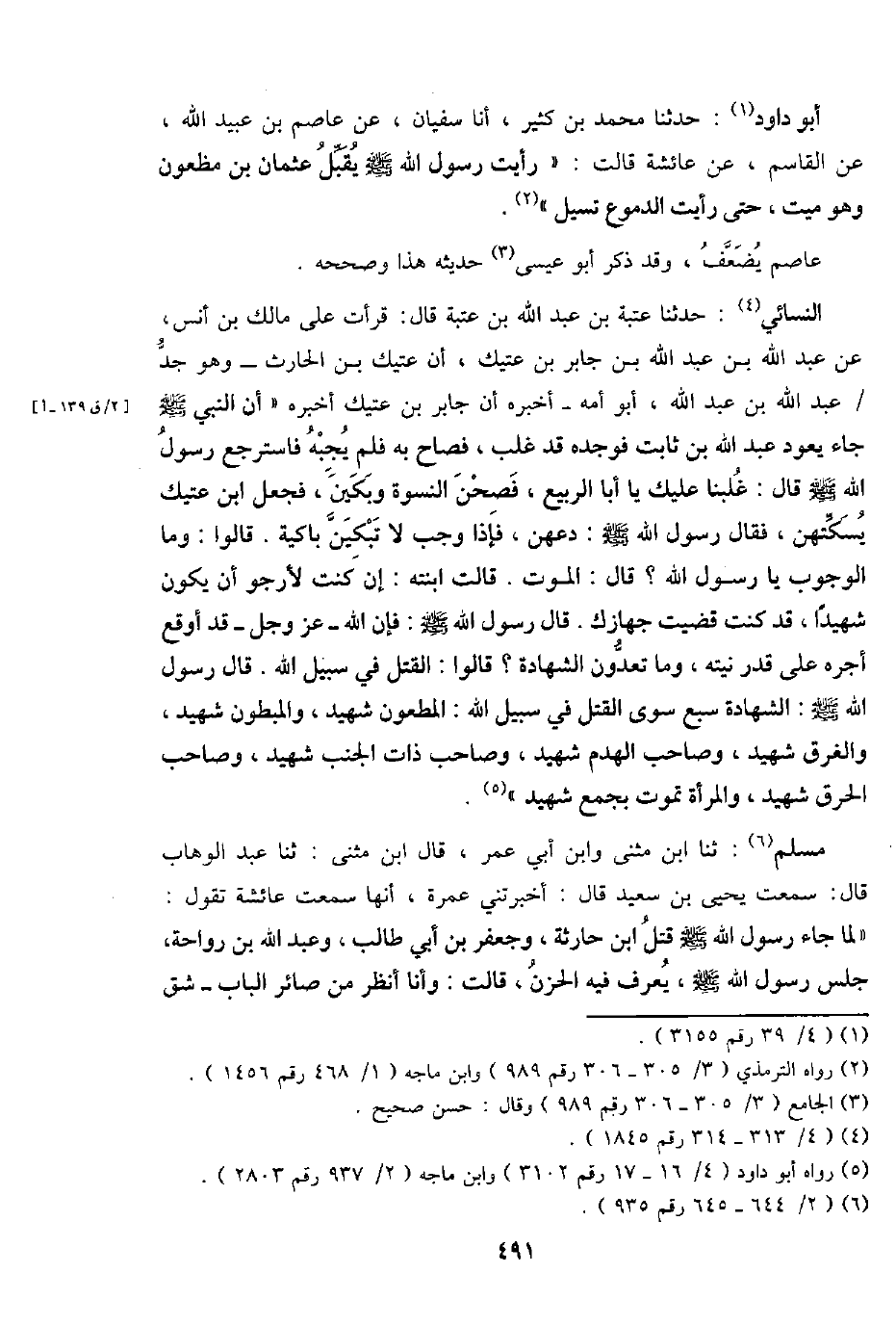 أَبُو دَاوُد: حَدثنَا مُحَمَّد بن كثير، أَنا سُفْيَان، عَن عَاصِم بن عبيد الله، عَن الْقَاسِم، عَن عَائِشَة قَالَت: " رَأَيْت رَسُول الله - صَلَّى اللَّهُ عَلَيْهِ وَسَلَّم َ - يقبل عُثْمَان بن مَظْعُون وَهُوَ ميت، حَتَّى رَأَيْت الدُّمُوع تسيل ".