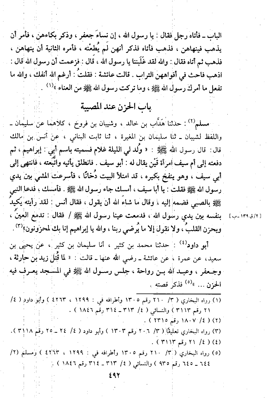 مُسلم: حَدثنَا هداب بن خَالِد، وشيبان بن فروخ، كِلَاهُمَا عَن سُلَيْمَان - وَاللَّفْظ لشيبان - ثَنَا سُلَيْمَان بن الْمُغيرَة، ثَنَا ثَابت الْبنانِيّ، عَن أنس بن مَالك قَالَ: قَالَ رَسُول الله - صَلَّى اللَّهُ عَلَيْهِ وَسَلَّم َ -: " ولد لي اللَّيْلَة غُلَام فسميته باسم أبي: إِبْرَاهِيم، ثمَّ دَفعته إِلَى أم سيف امْرَأَة قين يُقَال لَهُ: أَبُو سيف. فَانْطَلق يَأْتِيهِ واتبعته، فَانْتهى إِلَى أبي سيف، وَهُوَ ينْفخ بكيره، قد امْتَلَأَ الْبَيْت دخانا، فأسرعت الْمَشْي بَين يَدي رَسُول الله - صَلَّى اللَّهُ عَلَيْهِ وَسَلَّم َ - فَقلت: يَا أَبَا سيف، أمسك جَاءَ رَسُول الله - صَلَّى اللَّهُ عَلَيْهِ وَسَلَّم َ -. فَأمْسك، فَدَعَا النَّبِي - صَلَّى اللَّهُ عَلَيْهِ وَسَلَّم َ - بِالصَّبِيِّ فضمه إِلَيْهِ، وَقَالَ مَا شَاءَ الله أَن يَقُول، فَقَالَ أنس: لقد رَأَيْته يكيد بِنَفسِهِ بَين يَدي رَسُول الله، فَدَمَعَتْ عينا رَسُول الله - صَلَّى اللَّهُ عَلَيْهِ وَسَلَّم َ - / فَقَالَ: تَدْمَع الْعين، ويحزن الْقلب، وَلَا نقُول إِلَّا مَا يُرْضِي رَبنَا، وَالله يَا إِبْرَاهِيم إِنَّا بك لَمَحْزُونُونَ ".