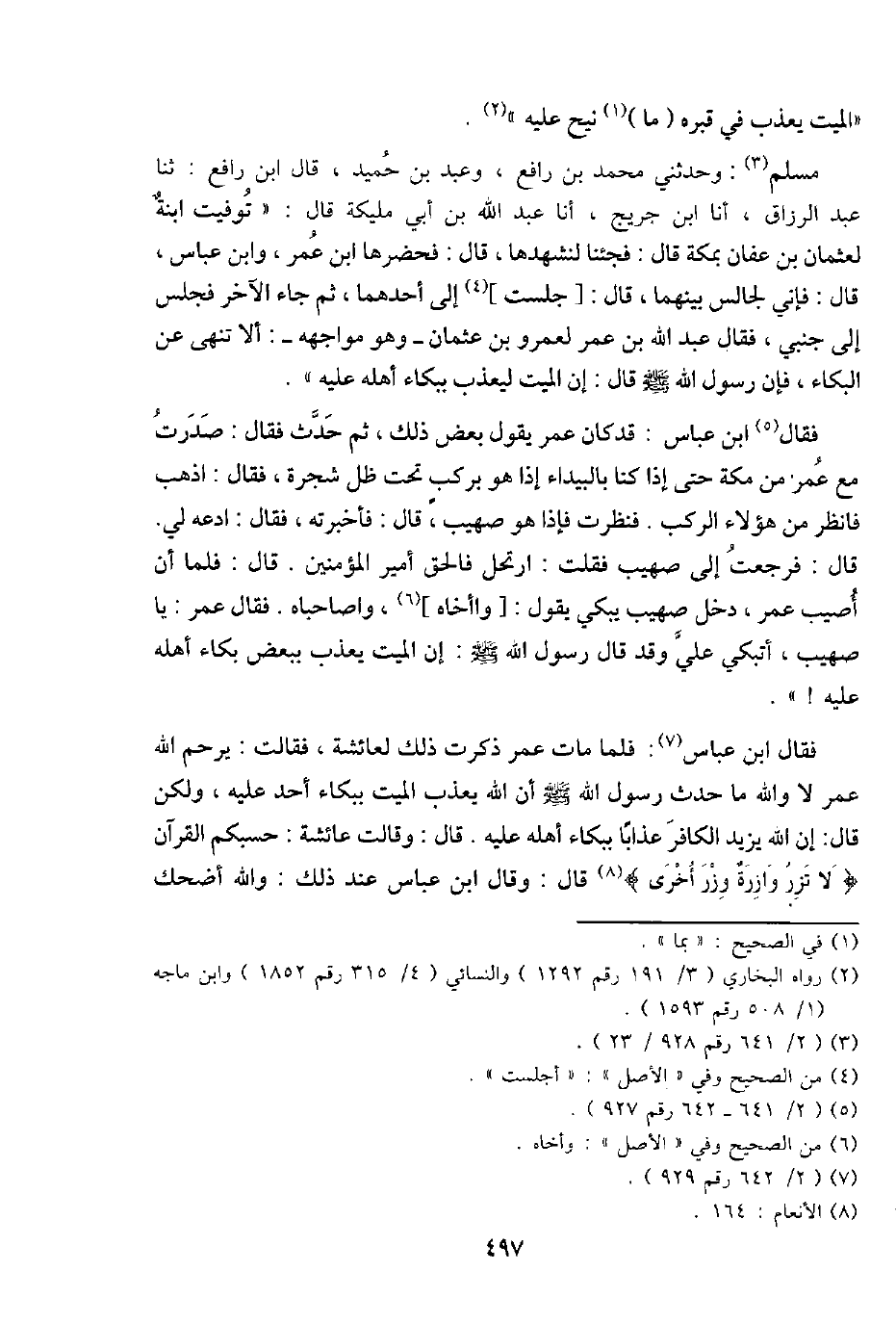 مُسلم: وحَدثني مُحَمَّد بن رَافع، وَعبد بن حميد، قَالَ ابْن رَافع: ثَنَا عبد الرَّزَّاق، أَنا ابْن جريج، أَنا عبد الله بن أبي مليكَة قَالَ: " توفيت ابْنة لعُثْمَان بن عَفَّان بِمَكَّة قَالَ: فَجِئْنَا لنشهدها، قَالَ: فحضرها ابْن عمر، وَابْن عَبَّاس، قَالَ: فَإِنِّي لجالس بَينهمَا، قَالَ: [جَلَست] إِلَى أَحدهمَا، ثمَّ جَاءَ الآخر فَجَلَسَ إِلَى جَنْبي، فَقَالَ عبد الله بن عمر لعَمْرو بن عُثْمَان - وَهُوَ مواجهه -: أَلا تنْهى عَن الْبكاء، فَإِن رَسُول الله - صَلَّى اللَّهُ عَلَيْهِ وَسَلَّم َ - قَالَ: إِن الْمَيِّت ليعذب ببكاء أَهله عَلَيْهِ ".