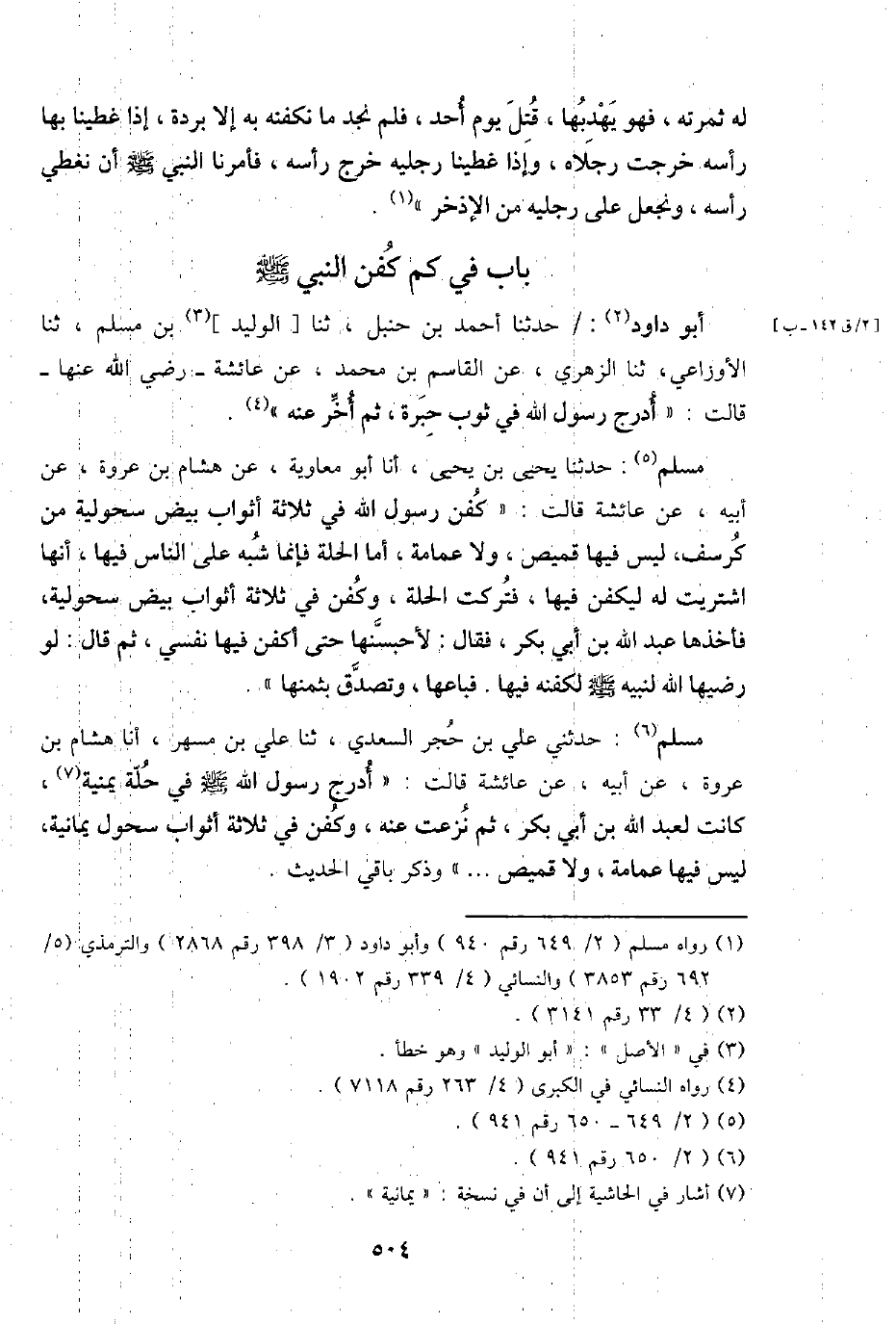 مُسلم: حَدثنَا يحيى بن يحيى، أَنا أَبُو مُعَاوِيَة، عَن هِشَام بن عُرْوَة، عَن أَبِيه، عَن عَائِشَة قَالَت: " كفن رَسُول الله فِي ثَلَاثَة أَثوَاب بيض سحُولِيَّة من كُرْسُف، لَيْسَ فِيهَا قَمِيص، وَلَا عِمَامَة، أما الْحلَّة فَإِنَّمَا شبه على النَّاس فِيهَا، أَنَّهَا اشْتريت لَهُ ليكفن فِيهَا، فَتركت الْحلَّة، وكفن فِي ثَلَاثَة أَثوَاب بيض سحُولِيَّة، فَأَخذهَا عبد الله بن أبي بكر، فَقَالَ: لأحبسنها حَتَّى أكفن فِيهَا نَفسِي، ثمَّ قَالَ: لَو رضيها الله لنَبيه - صَلَّى اللَّهُ عَلَيْهِ وَسَلَّم َ - لكفنه فِيهَا. فَبَاعَهَا، وَتصدق بِثمنِهَا ".