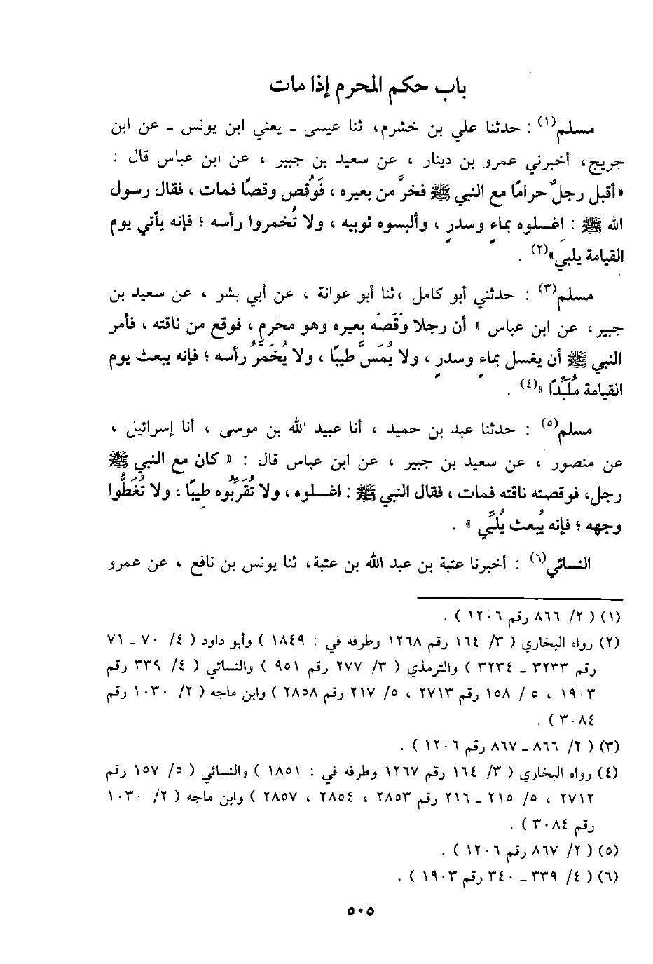 مُسلم: حَدثنَا عَليّ بن خشرم، ثَنَا عِيسَى - يَعْنِي ابْن يُونُس - عَن ابْن جريج، أَخْبرنِي عَمْرو بن دِينَار، عَن سعيد بن جُبَير، عَن ابْن عَبَّاس قَالَ: " أقبل رجل حَرَامًا مَعَ النَّبِي - صَلَّى اللَّهُ عَلَيْهِ وَسَلَّم َ - فَخر من بعيره، فوقص وقصا فَمَاتَ، فَقَالَ رَسُول الله - صَلَّى اللَّهُ عَلَيْهِ وَسَلَّم َ -: اغسلوه بِمَاء وَسدر، وألبسوه ثوبيه، وَلَا تخمروا رَأسه؛ فَإِنَّهُ يَأْتِي يَوْم الْقِيَامَة يُلَبِّي ".