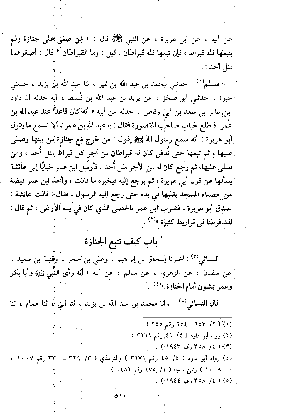 مُسلم: حَدثنِي مُحَمَّد بن عبد الله بن نمير، ثَنَا عبد الله بن يزِيد، حَدثنِي حَيْوَة، حَدثنِي أَبُو صَخْر، عَن يزِيد بن عبد الله بن قسيط، أَنه حَدثهُ أَن دَاوُد ابْن عَامر بن سعد بن أبي وَقاص، حَدثهُ عَن أَبِيه " أَنه كَانَ قَاعِدا عِنْد عبد الله بن عمر إِذْ طلع خباب صَاحب الْمَقْصُورَة فَقَالَ: يَا عبد الله بن عمر، أَلا تسمع مَا يَقُول أَبُو هُرَيْرَة: أَنه سمع رَسُول الله - صَلَّى اللَّهُ عَلَيْهِ وَسَلَّم َ - يَقُول: من خرج مَعَ جَنَازَة من بَيتهَا وَصلى عَلَيْهَا، ثمَّ تبعها حَتَّى تدفن كَانَ لَهُ قيراطان من أجر كل قِيرَاط مثل أحد، وَمن صلى عَلَيْهَا، ثمَّ رَجَعَ كَانَ لَهُ من الْأجر مثل أحد. فَأرْسل ابْن عمر خبابا إلىعائشة يسْأَلهَا عَن قَول أبي هُرَيْرَة، ثمَّ يرجع إِلَيْهِ فيخبره مَا قَالَت، وَأخذ ابْن عمر قَبْضَة من حَصْبَاء الْمَسْجِد يقلبها فِي يَده حَتَّى رَجَعَ إِلَيْهِ الرَّسُول، فَقَالَ: قَالَت عَائِشَة: صدق أَبُو هُرَيْرَة، فَضرب ابْن عمر بالحصى الَّذِي كَانَ فِي يَده الأَرْض، ثمَّ قَالَ: لقد فرطنا فِي قراريط كَثِيرَة ".