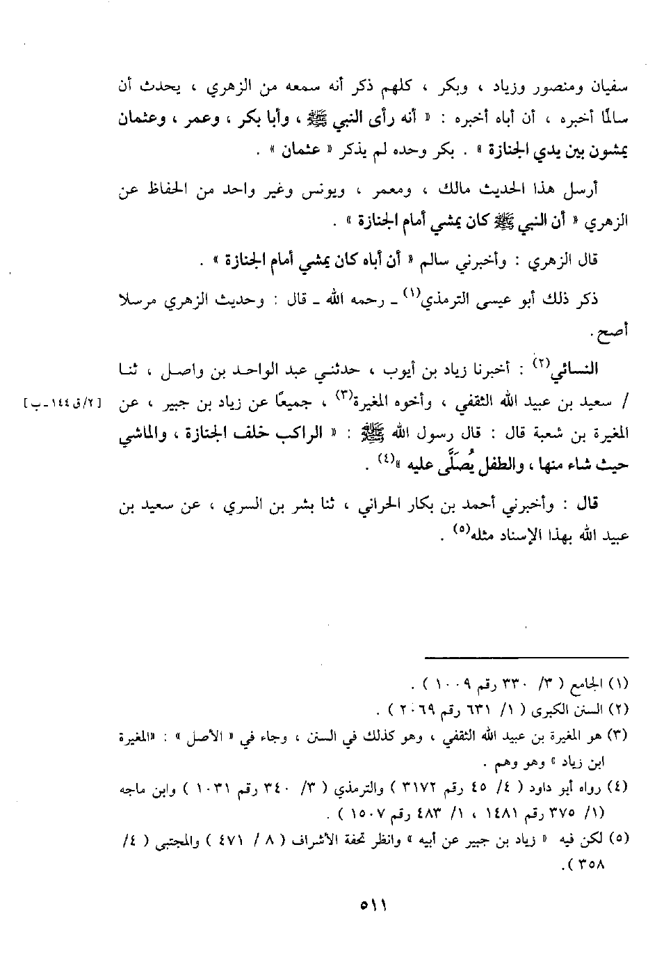 النَّسَائِيّ: أخبرنَا زِيَاد بن أَيُّوب، حَدثنِي عبد الْوَاحِد بن وَاصل، ثَنَا / سعيد بن عبيد الله الثَّقَفِيّ، وَأَخُوهُ الْمُغيرَة، جَمِيعًا عَن زِيَاد بن جُبَير، عَن الْمُغيرَة بن شُعْبَة قَالَ: قَالَ رَسُول الله - صَلَّى اللَّهُ عَلَيْهِ وَسَلَّم َ -: " الرَّاكِب خلف الْجِنَازَة، والماشي حَيْثُ شَاءَ مِنْهَا، والطفل يصلى عَلَيْهِ ".