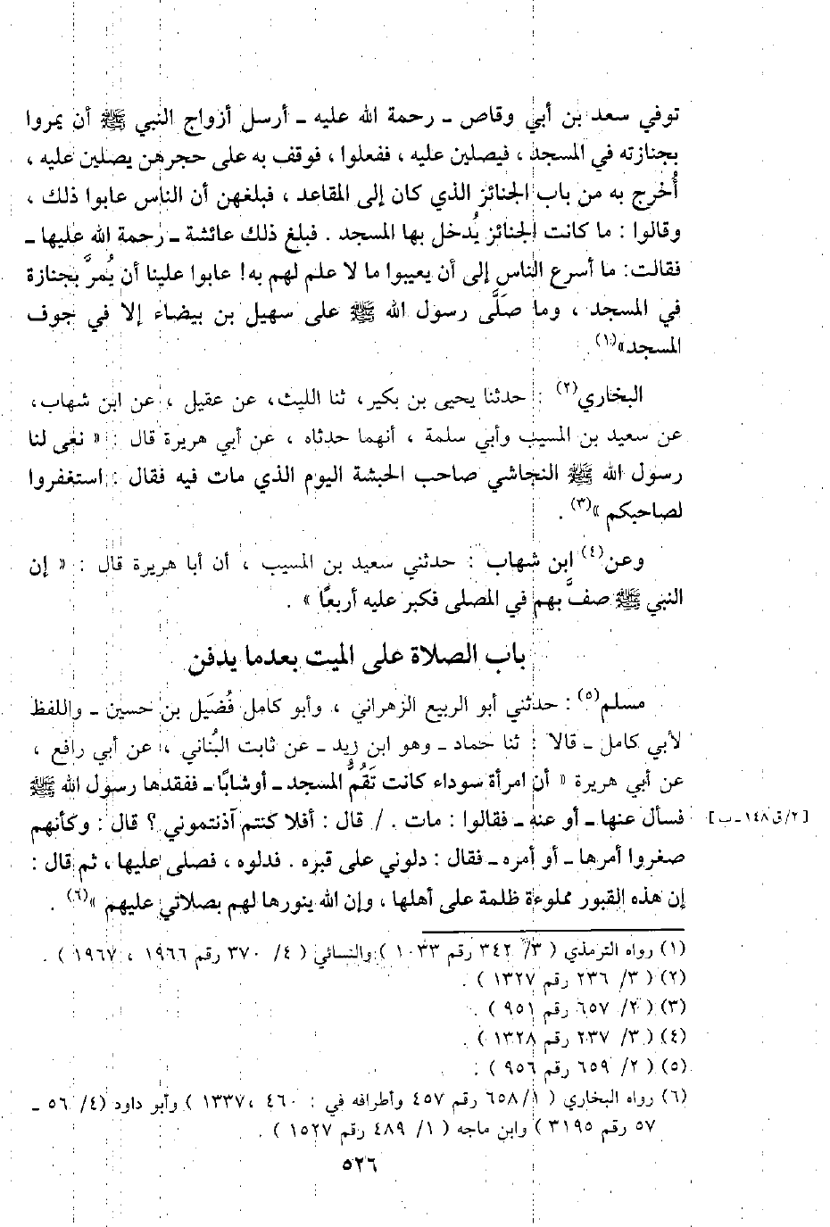 مُسلم: حَدثنِي أَبُو الرّبيع الزهْرَانِي، وَأَبُو كَامِل فُضَيْل بن حُسَيْن - وَاللَّفْظ لأبي كَامِل - قَالَا: ثَنَا حَمَّاد - وَهُوَ ابْن زيد - عَن ثَابت الْبنانِيّ، عَن أبي رَافع، عَن أبي هُرَيْرَة " أَن امْرَأَة سَوْدَاء كَانَت تقم الْمَسْجِد - أَو شَابًّا - ففقدها رَسُول الله - صَلَّى اللَّهُ عَلَيْهِ وَسَلَّم َ - فَسَأَلَ عَنْهَا - أَو عَنهُ - فَقَالُوا: مَاتَ. / قَالَ: أَفلا كُنْتُم آذنتموني؟ قَالَ: وَكَأَنَّهُم صغروا أمرهَا - أَو أمره - فَقَالَ: دلوني على قَبره. فدلوه، فصلى عَلَيْهَا، ثمَّ قَالَ: إِن هَذِه الْقُبُور مَمْلُوءَة ظلمَة على أَهله، وَإِن الله ينورها لَهُم بصلاتي عَلَيْهِم ".