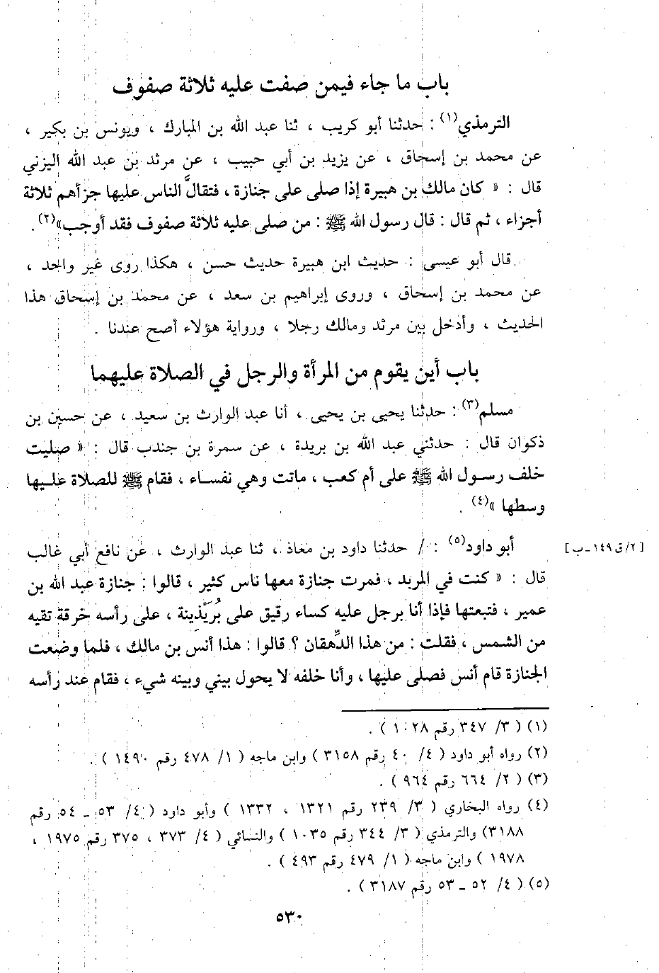 التِّرْمِذِيّ: حَدثنَا أَبُو كريب، ثَنَا عبد الله بن الْمُبَارك، وَيُونُس بن بكير، عَن مُحَمَّد بن إِسْحَاق، عَن يزِيد بن أبي حبيب، عَن مرْثَد بن عبد الله الْيَزنِي قَالَ: " كَانَ مَالك بن هُبَيْرَة إِذا صلى على جَنَازَة، فتقال النَّاس عَلَيْهَا جزأهم ثَلَاثَة أَجزَاء، ثمَّ قَالَ: قَالَ رَسُول الله - صَلَّى اللَّهُ عَلَيْهِ وَسَلَّم َ -: من صلى عَلَيْهِ ثَلَاثَة صُفُوف فقد أوجب ".