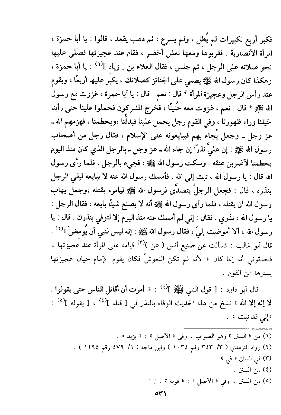 فَكبر أَربع تَكْبِيرَات لم يطلّ، وَلم يسْرع، ثمَّ ذهب يقْعد، قَالُوا: يَا أَبَا حَمْزَة، الْمَرْأَة الْأَنْصَارِيَّة. فقربوها وَمَعَهَا نعش أَخْضَر، فَقَامَ عِنْد عجيزتها فصلى عَلَيْهَا نَحْو صلَاته على الرجل، ثمَّ جلس، فَقَالَ الْعَلَاء بن [زِيَاد] : يَا أَبَا حَمْزَة، وَهَكَذَا كَانَ رَسُول الله - صَلَّى اللَّهُ عَلَيْهِ وَسَلَّم َ - يُصَلِّي على الْجَنَائِز كصلاتك، يكبر عَلَيْهَا أَرْبعا، وَيقوم عِنْد رَأس الرجل وعجيزة الْمَرْأَة؟ قَالَ: نعم. قَالَ: يَا أَبَا حَمْزَة، غزوت مَعَ رَسُول الله - صَلَّى اللَّهُ عَلَيْهِ وَسَلَّم َ -؟ قَالَ: نعم، غزوت مَعَه حنينا، فَخرج الْمُشْركُونَ فحملوا علينا حَتَّى رَأينَا خَيْلنَا وَرَاء ظُهُورنَا، وَفِي الْقَوْم رجل يحمل علينا فيدقنا، ويحطمنا، فَهَزَمَهُمْ الله - عز وَجل - وَجعل يجاء بهم فيبايعونه على الْإِسْلَام، فَقَالَ رجل من أَصْحَاب رَسُول الله - صَلَّى اللَّهُ عَلَيْهِ وَسَلَّم َ -: إِن عَليّ نذرا إِن جَاءَ الله - عز وَجل - بِالرجلِ الَّذِي كَانَ مُنْذُ الْيَوْم يحطمنا لَأَضرِبَن عُنُقه. وَسكت رَسُول الله - صَلَّى اللَّهُ عَلَيْهِ وَسَلَّم َ -، فجيء بِالرجلِ، فَلَمَّا رأى رَسُول الله قَالَ: يَا رَسُول الله، تبت إِلَى الله. فَأمْسك رَسُول الله عَنهُ لَا يبايعه ليفي الرجل بنذره، قَالَ: فَجعل الرجل يتَصَدَّى لرَسُول الله - صَلَّى اللَّهُ عَلَيْهِ وَسَلَّم َ - ليأمره بقتْله، وَجعل يهاب رَسُول الله أَن يقْتله، فَلَمَّا رأى رَسُول الله - صَلَّى اللَّهُ عَلَيْهِ وَسَلَّم َ - أَنه لَا يصنع شَيْئا بَايعه، فَقَالَ الرجل: يَا رَسُول الله، نذري. فَقَالَ: إِنِّي لم أمسك عَنهُ مُنْذُ الْيَوْم إِلَّا لِتوفي بِنَذْرِك. قَالَ: يَا رَسُول الله، أَلا أموضت إِلَيّ، فَقَالَ رَسُول الله - صَلَّى اللَّهُ عَلَيْهِ وَسَلَّم َ -: إِنَّه لَيْسَ لنَبِيّ أَن يُومِض ". قَالَ أَبُو غَالب: فَسَأَلت عَن صَنِيع أنس (عَن) قِيَامه على الْمَرْأَة عِنْد عجيزتها، فحدثوني أَنه إِنَّمَا كَانَ؛ لِأَنَّهُ لم تكن النعوش فَكَانَ يقوم الإِمَام حِيَال عجيزتها يَسْتُرهَا من الْقَوْم.