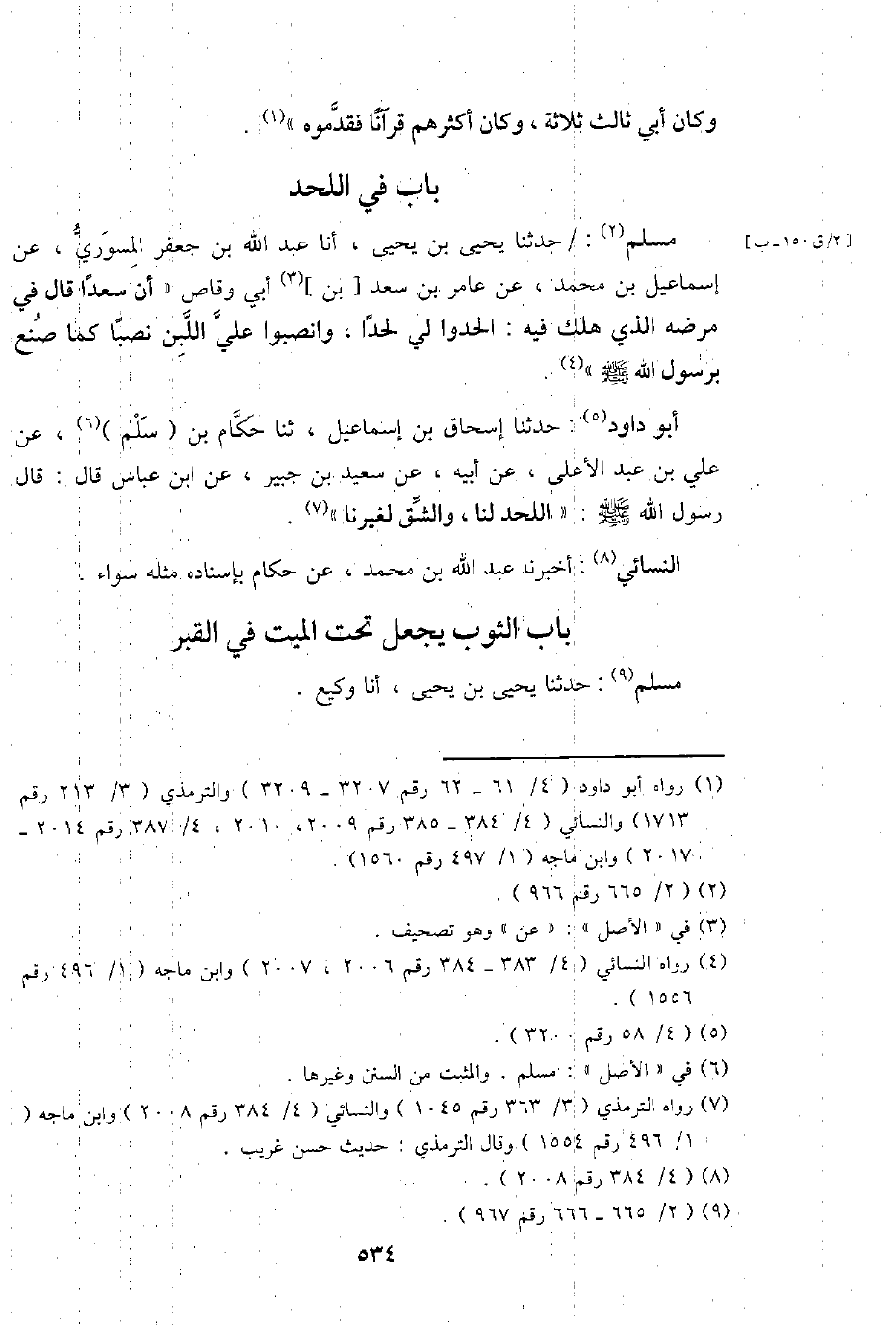 مُسلم: / حَدثنَا يحيى بن يحيى، أَنا عبد الله بن جَعْفَر المسوري، عَن إِسْمَاعِيل بن مُحَمَّد، عَن عَامر بن سعد [بن] أبي وَقاص " أَن سَعْدا قَالَ فِي مَرضه الَّذِي هلك فِيهِ: الحدوا لي لحدا، وانصبوا عَليّ اللَّبن نصبا كَمَا صنع برَسُول الله - صَلَّى اللَّهُ عَلَيْهِ وَسَلَّم َ - ".