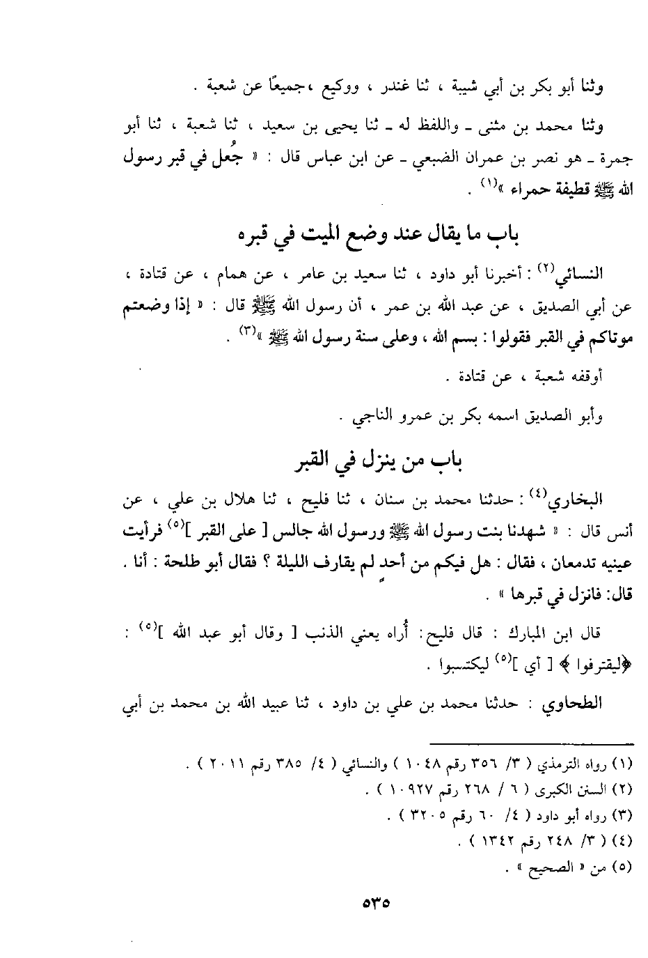 النَّسَائِيّ: أخبرنَا أَبُو دَاوُد، ثَنَا سعيد بن عَامر، عَن همام، عَن قَتَادَة، عَن أبي الصّديق، عَن عبد الله بن عمر، أَن رَسُول الله - صَلَّى اللَّهُ عَلَيْهِ وَسَلَّم َ - قَالَ: " إِذا وضعتم مَوْتَاكُم فِي الْقَبْر فَقولُوا: بِسم الله، وعَلى سنة رَسُول الله - صَلَّى اللَّهُ عَلَيْهِ وَسَلَّم َ - ".