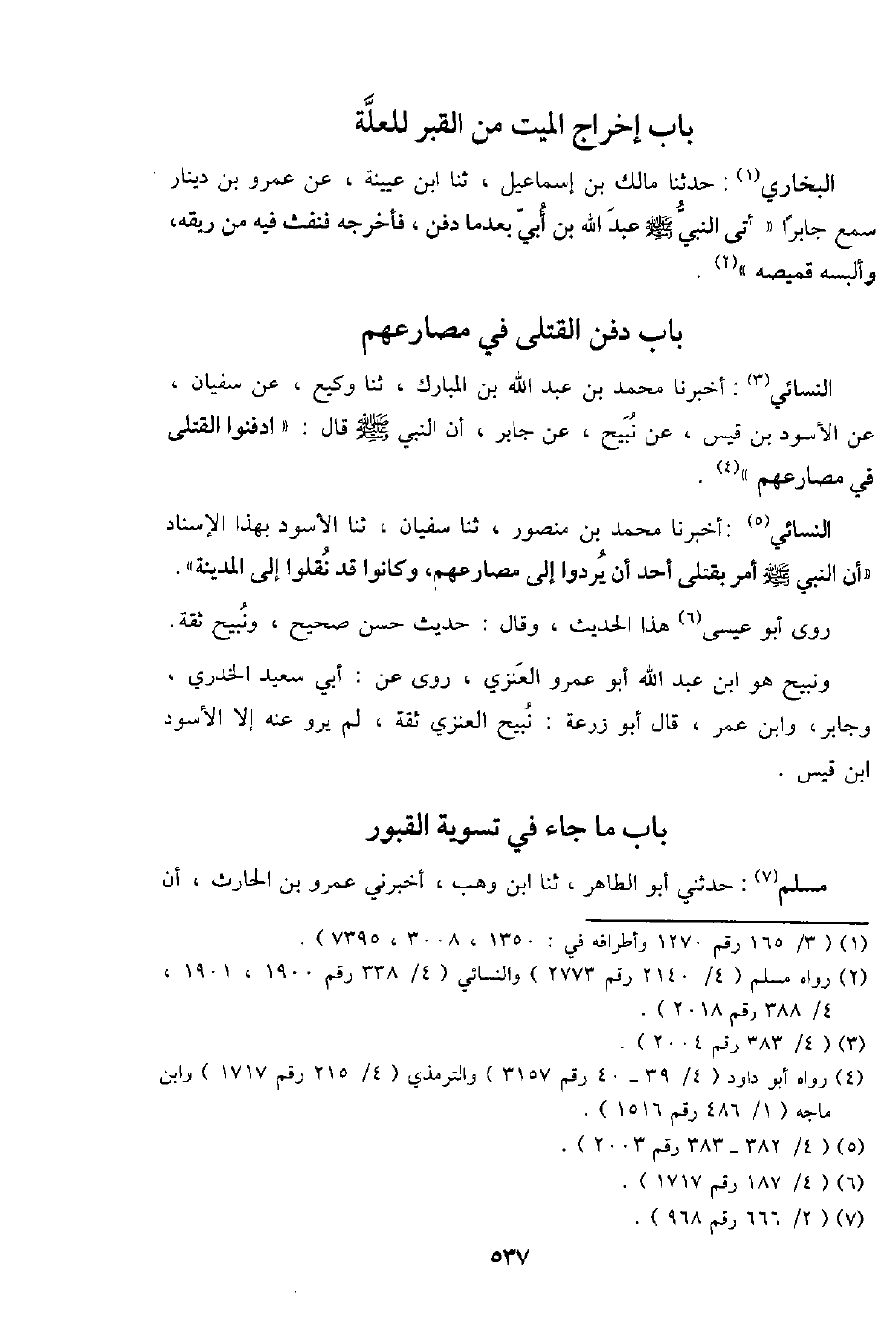 النَّسَائِيّ: أخبرنَا مُحَمَّد بن عبد الله بن الْمُبَارك، ثَنَا وَكِيع، عَن سُفْيَان، عَن الْأسود بن قيس، عَن نُبيح، عَن جَابر، أَن النَّبِي - صَلَّى اللَّهُ عَلَيْهِ وَسَلَّم َ - قَالَ: " ادفنوا الْقَتْلَى فِي مصارهم ".