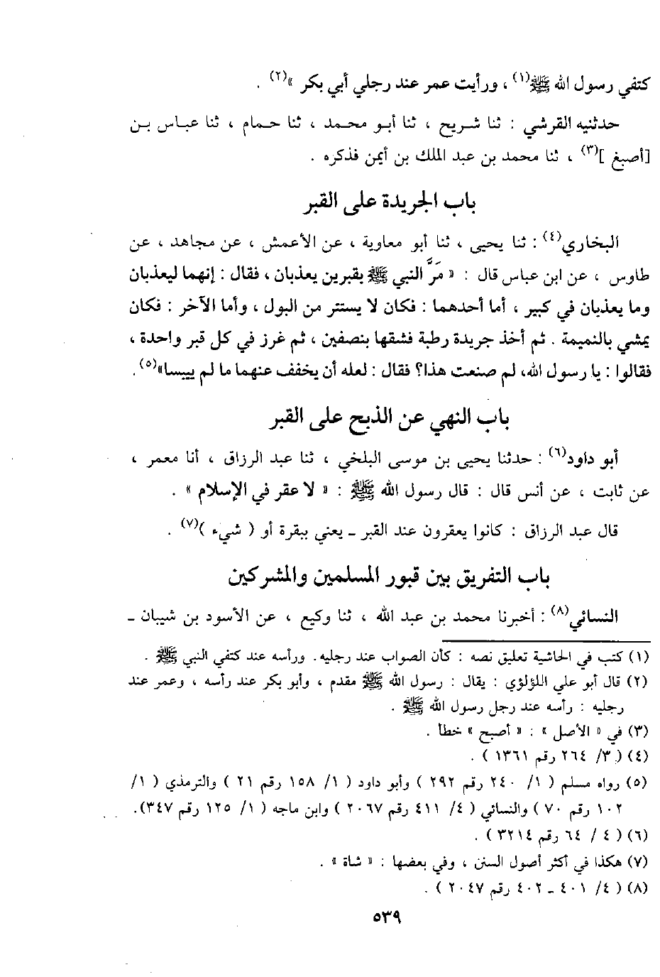 البُخَارِيّ: ثَنَا يحيى، ثَنَا أَبُو مُعَاوِيَة، عَن الْأَعْمَش، عَن مُجَاهِد، عَن طَاوس، عَن ابْن عَبَّاس قَالَ: " مر النَّبِي - صَلَّى اللَّهُ عَلَيْهِ وَسَلَّم َ - بقبرين يعذبان، فَقَالَ: إنَّهُمَا ليعذبان وَمَا يعذبان فِي كَبِير، أما أَحدهمَا: فَكَانَ لَا يسْتَتر من الْبَوْل، وَأما الآخر: فَكَانَ يمشي بالنميمة. ثمَّ أَخذ جَرِيدَة رطبَة فَشَقهَا بنصفين، ثمَّ غرز فِي كل قبر وَاحِدَة، فَقَالُوا: يَا رَسُول الله، لم صنعت هَذَا؟ فَقَالَ: لَعَلَّه أَن يُخَفف عَنْهُمَا مَا لم ييبسا ".