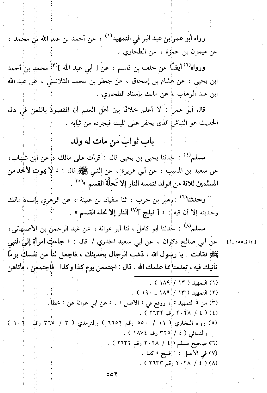 مُسلم: حَدثنَا يحيى بن يحيى قَالَ: قَرَأت على مَالك، عَن ابْن شهَاب، عَن سعيد بن الْمسيب، عَن أبي هُرَيْرَة، عَن النَّبِي - صَلَّى اللَّهُ عَلَيْهِ وَسَلَّم َ - قَالَ: " لَا يَمُوت لأحد من الْمُسلمين ثَلَاثَة من الْوَلَد فَتَمَسهُ النَّار إِلَّا تَحِلَّة الْقسم ".
