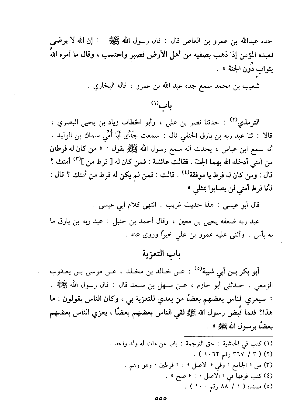 أَبُو بكر بن أبي شيبَة: عَن خَالِد بن مخلد، عَن مُوسَى بن يَعْقُوب الزمعِي، حَدثنِي أَبُو حَازِم، عَن سهل بن سعد قَالَ: قَالَ رَسُول الله - صَلَّى اللَّهُ عَلَيْهِ وَسَلَّم َ -: " سيعزي النَّاس بَعضهم بَعْضًا من بعدِي للتعزية بِي، وَكَانَ النَّاس يَقُولُونَ: مَا هَذَا؟ فَلَمَّا قبض رَسُول الله - صَلَّى اللَّهُ عَلَيْهِ وَسَلَّم َ - لَقِي النَّاس بَعضهم، يعزي النَّاس بَعضهم بَعْضًا برَسُول الله - صَلَّى اللَّهُ عَلَيْهِ وَسَلَّم َ - ".
