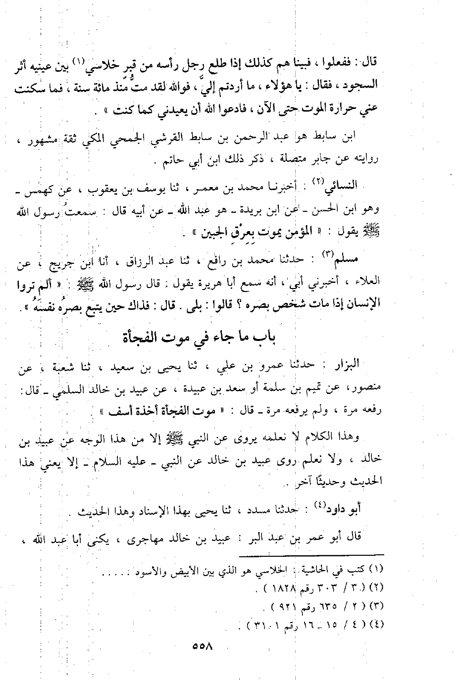 النَّسَائِيّ: أخبرنَا مُحَمَّد بن معمر، ثَنَا يُوسُف بن يَعْقُوب، عَن كهمس - وَهُوَ ابْن الْحسن - عَن ابْن بُرَيْدَة - هُوَ عبد الله - عَن أَبِيه قَالَ: سَمِعت رَسُول الله - صَلَّى اللَّهُ عَلَيْهِ وَسَلَّم َ - يَقُول: " الْمُؤمن يَمُوت بعرق الجبين ".