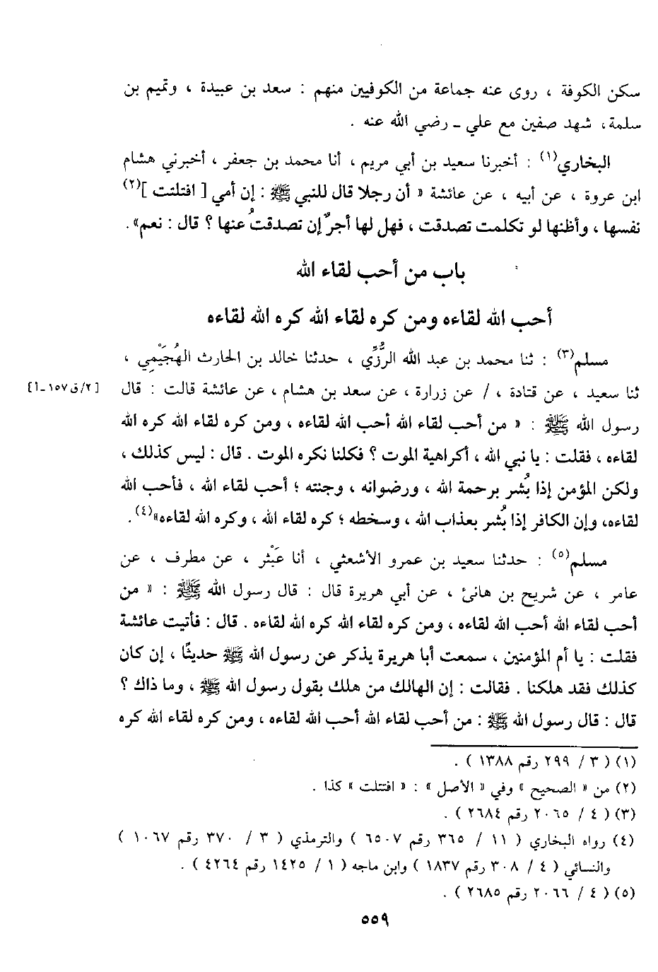 مُسلم: ثَنَا مُحَمَّد بن عبد الله الرزي، حَدثنَا خَالِد بن الْحَارِث الهُجَيْمِي، ثَنَا سعيد، عَن قتاده، / عَن زارة، عَن سعد بن هِشَام، عَن عَائِشَة قَالَت: قَالَ رَسُول الله - صَلَّى اللَّهُ عَلَيْهِ وَسَلَّم َ -: " من أحب لِقَاء الله أحب الله لقاءه، وَمن كره لِقَاء الله كره الله لقاءه، فَقلت: يَا نَبِي الله، أكراهية الْمَوْت؟ فكلنا نكره الْمَوْت. قَالَ: لَيْسَ كَذَلِك، وَلَكِن الْمُؤمن إِذا بشر برحمة الله، ورضوانه، وجنته؛ أحب لِقَاء الله، فَأحب الله لقاءه، وَإِن الْكَافِر إِذا بشر بِعَذَاب الله، وَسخطه؛ كره لِقَاء الله، وَكره الله لقاءه ".