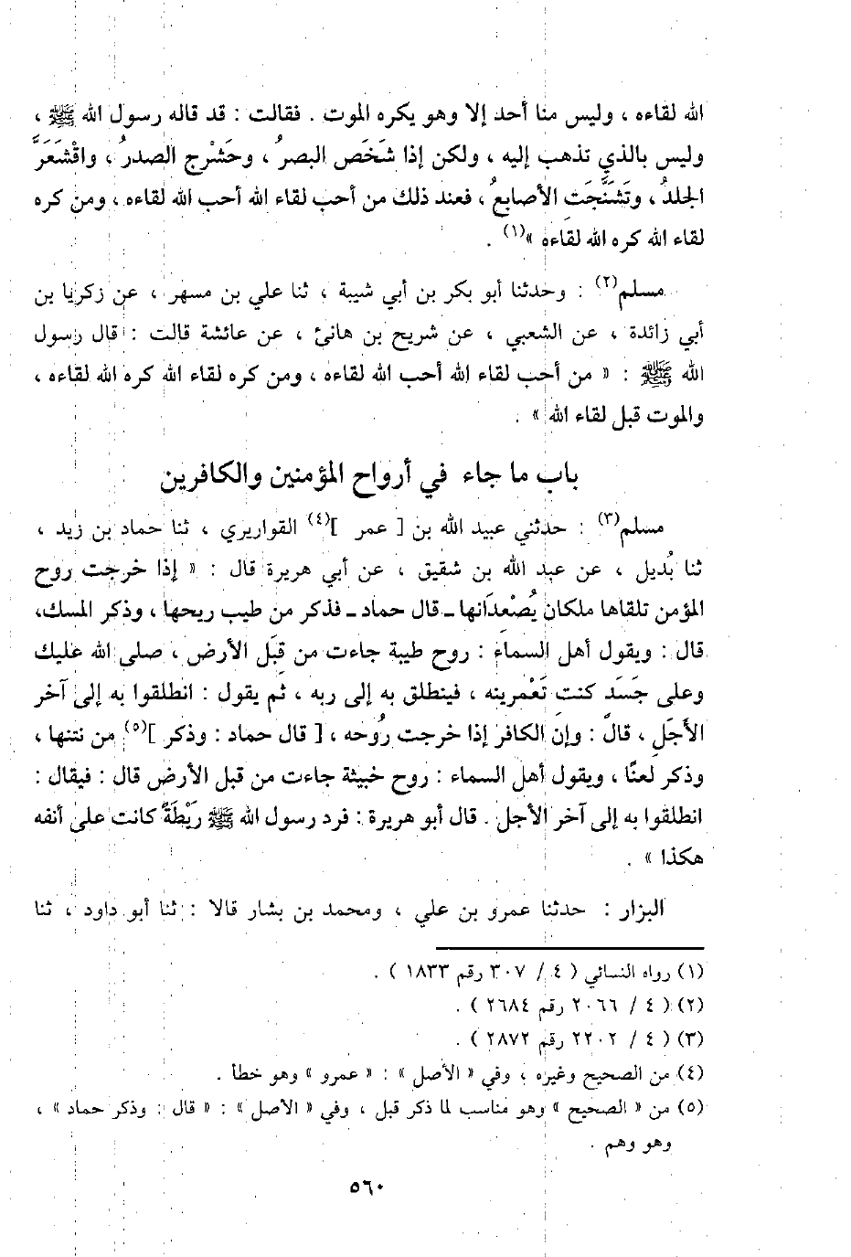 مُسلم: حَدثنِي عبيد الله بن [عمر] القواريري، ثَنَا حَمَّاد بن زيد، ثَنَا بديل، عَن عبد الله بن شَقِيق، عَن أبي هُرَيْرَة قَالَ: " إِذا خرجت روح الْمُؤمن تلقاها ملكان يصعدانها - قَالَ حَمَّاد - فَذكر من طيب رِيحهَا، وَذكر الْمسك، قَالَ: وَيَقُول أهل السَّمَاء: روح طيبَة جَاءَت من قبل الأَرْض، صلى الله عَلَيْك وعَلى جَسَد كنت تعمرينه، فَينْطَلق بِهِ إِلَى ربه، ثمَّ يَقُول: انْطَلقُوا بِهِ إِلَى آخر الْأَجَل، قَالَ: وَإِن الْكَافِر إِذا خرجت روحه، [قَالَ حَمَّاد: وَذكر] من نتنها، وَذكر لعنا، وَيَقُول أهل السَّمَاء: روح خبيثة جَاءَت من قبل الأَرْض قَالَ: فَيُقَال: انْطَلقُوا بِهِ إِلَى آخر الْأَجَل. قَالَ أَبُو هُرَيْرَة: فَرد رَسُول الله - صَلَّى اللَّهُ عَلَيْهِ وَسَلَّم َ - ريطة كَانَت على أَنفه هَكَذَا ".