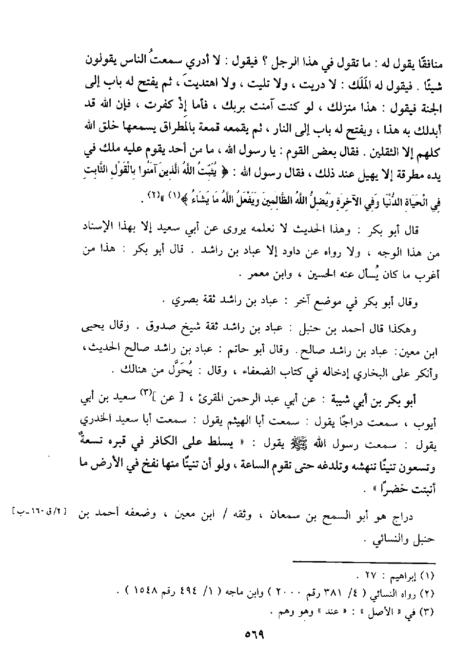 أَبُو بكر بن أبي شيبَة: عَن أبي عبد الرَّحْمَن الْمُقْرِئ، [عَن] سعيد بن أبي أَيُّوب، سَمِعت دَرَّاجًا يَقُول: سَمِعت أَبَا الْهَيْثَم يَقُول: سَمِعت أَبَا سعيد الْخُدْرِيّ يَقُول: سَمِعت رَسُول الله - صَلَّى اللَّهُ عَلَيْهِ وَسَلَّم َ - يَقُول: " يُسَلط على الْكَافِر فِي قَبره تِسْعَة وَتسْعُونَ تنينا تنهشه وتلدغه حَتَّى تقوم السَّاعَة، وَلَو أَن تنينا مِنْهَا نفخ فِي الأَرْض مَا أنبتت خضرًا ".