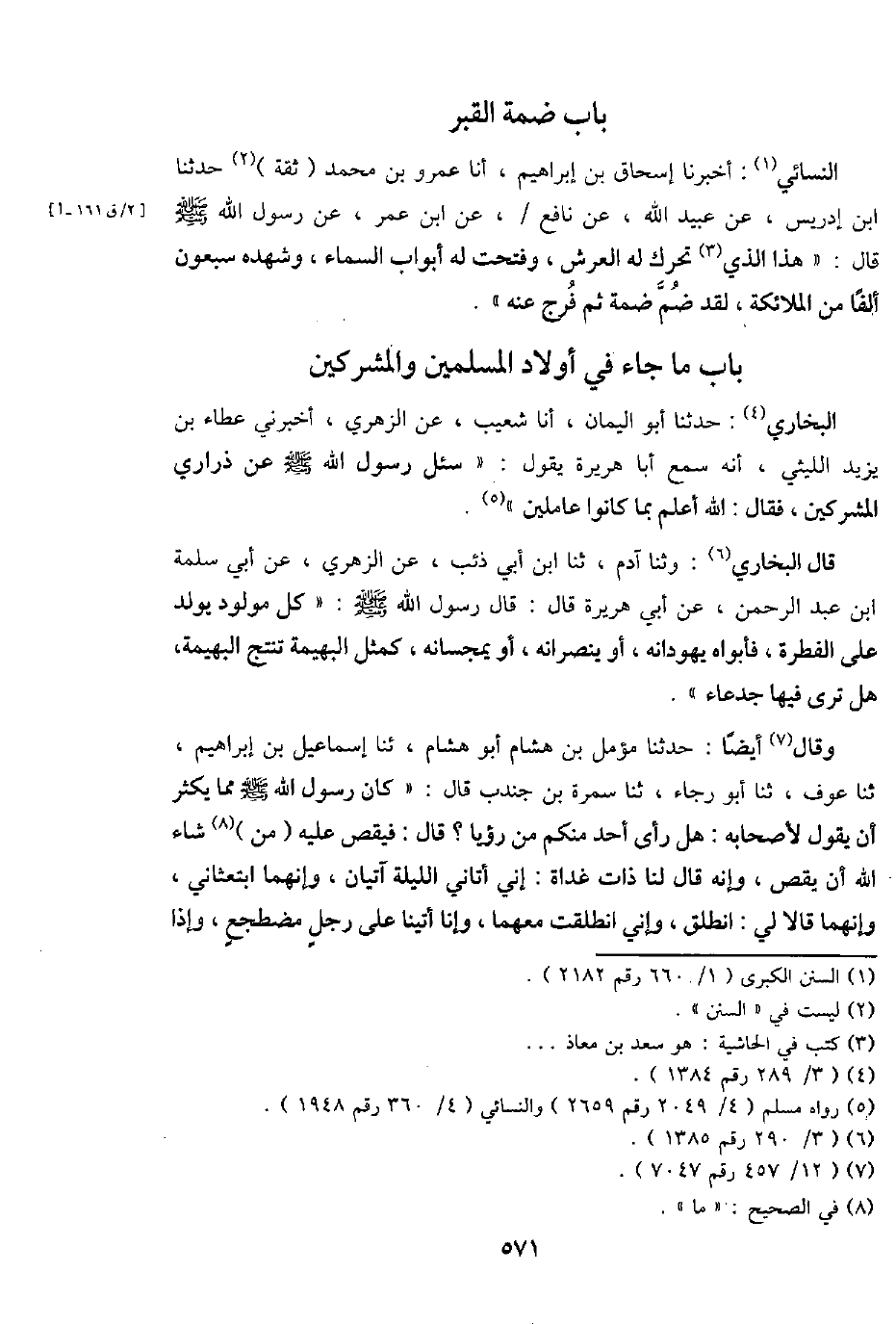 النَّسَائِيّ: أخبرنَا إِسْحَاق بن إِبْرَاهِيم، أَنا عَمْرو بن مُحَمَّد (ثِقَة) حَدثنَا ابْن إِدْرِيس، عَن عبيد الله، عَن نَافِع /، عَن ابْن عمر، عَن رَسُول الله - صَلَّى اللَّهُ عَلَيْهِ وَسَلَّم َ - قَالَ: " هَذَا الَّذِي تحرّك لَهُ الْعَرْش، وَفتحت لَهُ أَبْوَاب السَّمَاء، وشهده سَبْعُونَ ألفا من الْمَلَائِكَة، لقد ضم ضمة ثمَّ فرج عَنهُ ".