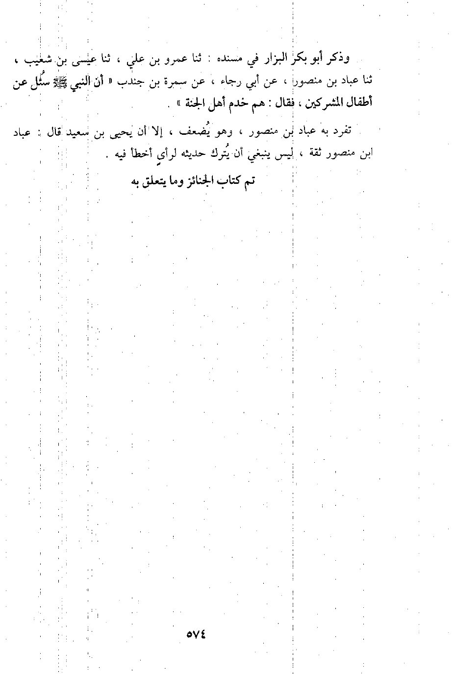 وَذكر أَبُو بكر الْبَزَّار فِي مُسْنده: ثَنَا عَمْرو بن عَليّ، ثَنَا عِيسَى بن شُعَيْب، ثَنَا عباد بن مَنْصُور، عَن أبي رَجَاء، عَن سَمُرَة بن جُنْدُب " أَن النَّبِي - صَلَّى اللَّهُ عَلَيْهِ وَسَلَّم َ - سُئِلَ عَن أَطْفَال الْمُشْركين، فَقَالَ: هم خدم أهل الْجنَّة ".