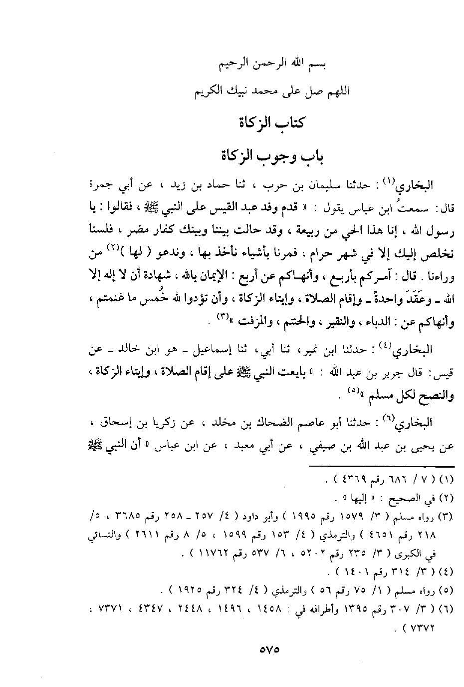 البُخَارِيّ: حَدثنَا سُلَيْمَان بن حَرْب، ثَنَا حَمَّاد بن زيد، عَن أبي جَمْرَة قَالَ: سَمِعت ابْن عَبَّاس يَقُول: " قدم وَفد عبد الْقَيْس على النَّبِي - صَلَّى اللَّهُ عَلَيْهِ وَسَلَّم َ -، فَقَالُوا: يَا رَسُول الله، إِنَّا هَذَا الْحَيّ من ربيعَة، وَقد حَالَتْ بَيْننَا وَبَيْنك كفار مُضر، فلسنا نخلص إِلَيْك إِلَّا فِي شهر حرَام، فمرنا بأَشْيَاء نَأْخُذ بهَا، وندعو (لَهَا) من وَرَاءَنَا. قَالَ: آمركُم بِأَرْبَع، وأنهاكم عَن أَربع: الْإِيمَان بِاللَّه، شَهَادَة أَن لَا إِلَه إِلَّا الله - وَعقد وَاحِدَة - وَأقَام الصَّلَاة، وإيتاء الزَّكَاة، وَأَن تُؤَدُّوا لله خمس مَا غَنِمْتُم، وأنهاكم عَن: الدُّبَّاء، والنقير، والحنتم، والمزفت ".