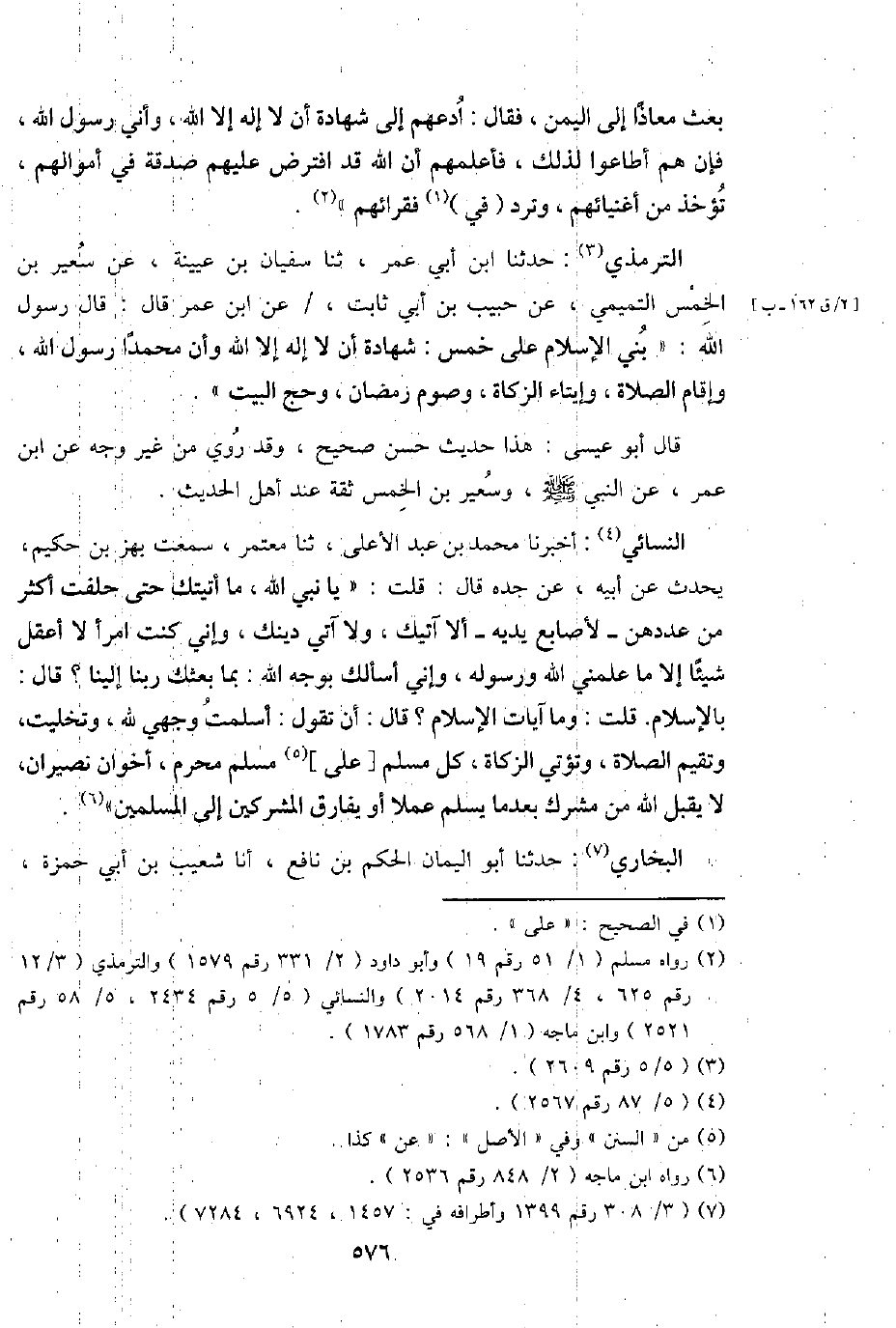 التِّرْمِذِيّ: حَدثنَا ابْن أبي عمر، ثَنَا سُفْيَان بن عُيَيْنَة، عَن سعير بن الْخمس التَّمِيمِي، عَن حبيب بن أبي ثَابت، / عَن ابْن عمر قَالَ: قَالَ رَسُول الله: " بني الْإِسْلَام على خمس: شَهَادَة أَن لَا إِلَه إِلَّا الله وَأَن مُحَمَّدًا رَسُول الله، وَأقَام الصَّلَاة، وإيتاء الزَّكَاة، وَصَوْم رَمَضَان، وَحج الْبَيْت ".