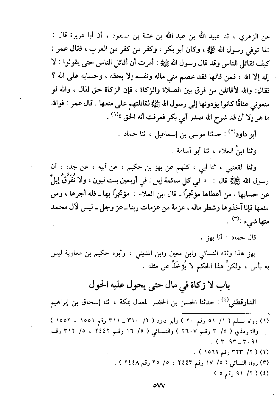 وثنا القعْنبِي، ثَنَا أبي، كلهم عَن بهز بن حَكِيم، عَن أَبِيه، عَن جده، أَن رَسُول الله - صَلَّى اللَّهُ عَلَيْهِ وَسَلَّم َ - قَالَ: " فِي كل سَائِمَة إبل: فِي أَرْبَعِينَ بنت لبون، وَلَا تفرق إبل عَن حِسَابهَا، من أَعْطَاهَا مُؤْتَجِرًا - قَالَ ابْن الْعَلَاء: مُؤْتَجِرًا بهَا - فَلهُ أجرهَا، وَمن منعهَا فَإنَّا آخِذُوهَا وَشطر مَاله، عَزمَة من عَزمَات رَبنَا - عز وَجل - لَيْسَ لآل مُحَمَّد مِنْهَا شَيْء ".
