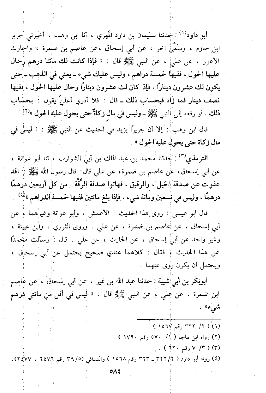 التِّرْمِذِيّ: حَدثنَا مُحَمَّد بن عبد الْملك بنأبي الشَّوَارِب، ثَنَا أَبُو عوَانَة، عَن أبي إِسْحَاق، عَن عَاصِم بن ضَمرَة، عَن عَليّ قَالَ: قَالَ رَسُول الله - صَلَّى اللَّهُ عَلَيْهِ وَسَلَّم َ -: " قد عَفَوْت عَن صَدَقَة الْخَيل، وَالرَّقِيق، فهاتوا صَدَقَة الرقة: من كل أَرْبَعِينَ درهما درهما، وَلَيْسَ فِي تسعين وَمِائَة شَيْء، فَإِذا بلغ مِائَتَيْنِ فَفِيهَا خَمْسَة الدَّرَاهِم ".