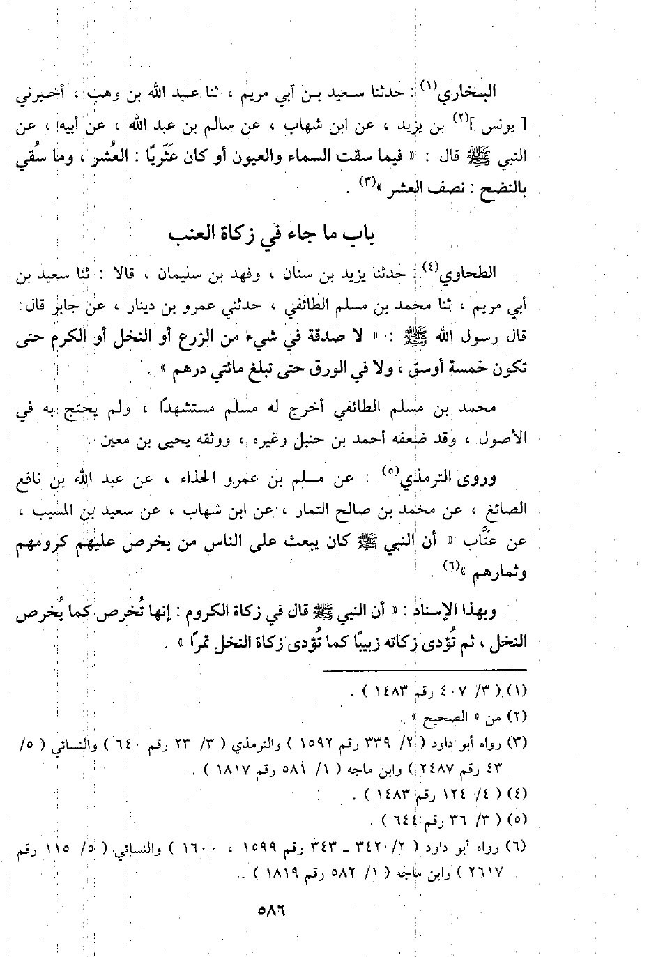 الطَّحَاوِيّ: حَدثنَا يزِيد بن سِنَان، وفهد بن سُلَيْمَان، قَالَا: ثَنَا سعيد بن أبي مَرْيَم، ثَنَا مُحَمَّد بن مُسلم الطَّائِفِي، حَدثنِي عَمْرو بن دِينَار، عَن جَابر قَالَ: قَالَ رَسُول الله - صَلَّى اللَّهُ عَلَيْهِ وَسَلَّم َ -: " لَا صَدَقَة فِي شَيْء من الزَّرْع أَو النّخل أَو الْكَرم حَتَّى تكون خَمْسَة أوسق، وَلَا فِي الْوَرق حَتَّى تبلغ مِائَتي دِرْهَم ".