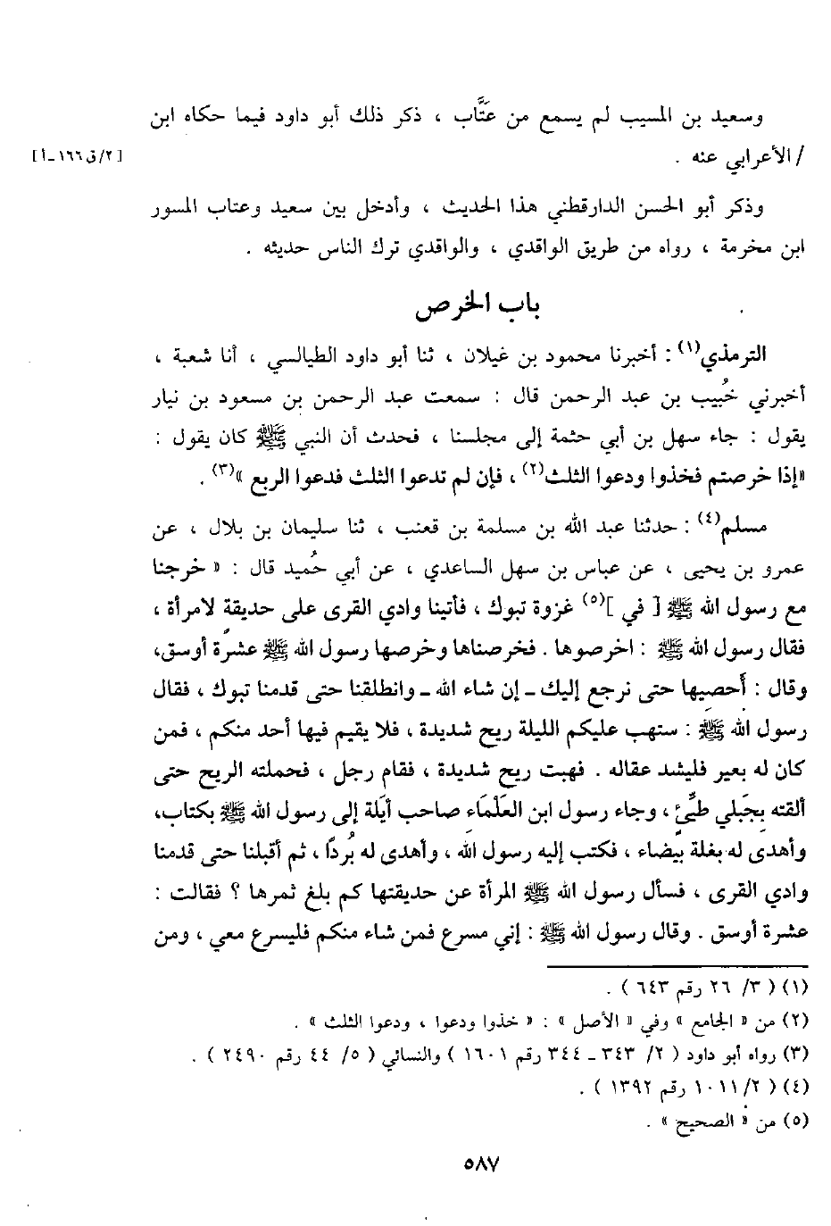 التِّرْمِذِيّ: أخبرنَا مَحْمُود بن غيلَان، ثَنَا أَبُو دَاوُد الطَّيَالِسِيّ، أَنا شُعْبَة، أَخْبرنِي خبيب بن عبد الرَّحْمَن قَالَ: سَمِعت عبد الرَّحْمَن بن مَسْعُود بن نيار يَقُول: جَاءَ سهل بن أبي حثْمَة إِلَى مَجْلِسنَا، فَحدث أَن النَّبِي - صَلَّى اللَّهُ عَلَيْهِ وَسَلَّم َ - كَانَ يَقُول: " إِذا خرصتم فَخُذُوا ودعوا الثُّلُث، فَإِن لم تدعوا الثُّلُث فدعوا الرّبع ".