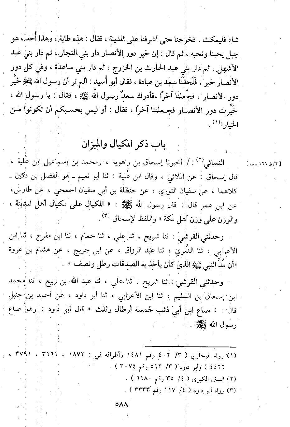 النَّسَائِيّ: / أخبرنَا إِسْحَاق بن رَاهْوَيْةِ، وَمُحَمّد بن إِسْمَاعِيل ابْن علية، قَالَ إِسْحَاق: عَن الْملَائي، وَقَالَ ابْن علية: ثَنَا أَبُو نعيم - هُوَ الْفضل بن دُكَيْن - كِلَاهُمَا، عَن سُفْيَان الثَّوْريّ، عَن حَنْظَلَة بن أبي سُفْيَان الجُمَحِي، عَن طَاوس، عَن ابْن عمر قَالَ: قَالَ رَسُول الله - صَلَّى اللَّهُ عَلَيْهِ وَسَلَّم َ -: ": " الْمِكْيَال على مكيال أهل الْمَدِينَة، وَالْوَزْن على وزن أهل مَكَّة " وَاللَّفْظ لإسحاق.