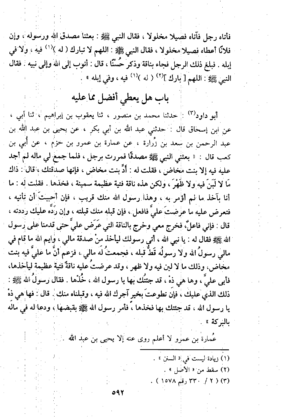 أَبُو دَاوُد: حَدثنَا مُحَمَّد بن مَنْصُور، ثَنَا يَعْقُوب بن إِبْرَاهِيم، ثَنَا أبي، عَن ابْن إِسْحَاق قَالَ: حَدثنِي عبد الله بن أبي بكر، عَن يحيى بن عبد الله بن عبد الرَّحْمَن بن سعد بن زُرَارَة، عَن عمَارَة بن عَمْرو بن حزم، عَن أبي بن كَعْب قَالَ: " بَعَثَنِي النَّبِي - صَلَّى اللَّهُ عَلَيْهِ وَسَلَّم َ - مُصدقا فمررت بِرَجُل، فَلَمَّا جمع لي مَاله لم أجد عَلَيْهِ فِيهِ إِلَّا بنت مَخَاض، فَقلت لَهُ: أد بنت مَخَاض، فَإِنَّهَا صدقتك، قَالَ: ذَاك مَا لَا لبن فِيهِ وَلَا ظهر، وَلَكِن هَذِه نَاقَة فتية عَظِيمَة سَمِينَة، فَخذهَا. فَقلت لَهُ: مَا أَنا بآخذ مَا لم أُؤمر بِهِ، وَهَذَا رَسُول الله مِنْك قريب، فَإِن أَحْبَبْت أَن تَأتيه، فتعرض عَلَيْهِ مَا عرضت عَليّ فافعل، فَإِن قبله مِنْك قبلته، وَإِن رده عَلَيْك رَددته، قَالَ: فَإِنِّي فَاعل، فَخرج معي وَخرج بالناقة الَّتِي عرض عَليّ حَتَّى قدمنَا على رَسُول الله - صَلَّى اللَّهُ عَلَيْهِ وَسَلَّم َ - فَقَالَ لَهُ: يانبي الله، أَتَى رَسُولك ليَأْخُذ من صَدَقَة مَالِي، وَايْم الله مَا قَامَ فِي مَالِي رَسُول الله وَلَا رَسُوله قطّ قبله، فَجمعت لَهُ مَالِي، فَزعم أَن مَا عَليّ فِيهِ بنت مَخَاض، وَذَلِكَ مَا لَا لبن فِيهِ وَلَا ظهر، وَقد عرضت عَلَيْهِ نَاقَة فتية عَظِيمَة ليأخذها، فَأبى عَليّ، وَهَا هِيَ ذه، قد جئْتُك بهَا يَا رَسُول الله، خُذْهَا. فَقَالَ رَسُول الله - صَلَّى اللَّهُ عَلَيْهِ وَسَلَّم َ -: ذَلِك الَّذِي عَلَيْك، فَإِن تَطَوَّعت بِخَير آجرك الله فِيهِ، وقبلناه مِنْك. قَالَ: فها هِيَ ذه يَا رَسُول الله، قد جئْتُك بهَا فَخذهَا، فَأمر رَسُول الله - صَلَّى اللَّهُ عَلَيْهِ وَسَلَّم َ - بقبضها، ودعا لَهُ فِي مَاله بِالْبركَةِ ".