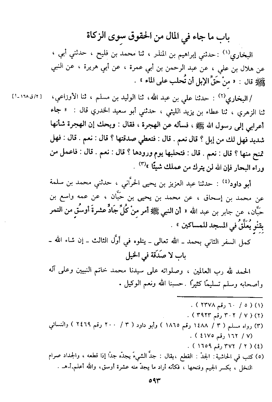 البُخَارِيّ: حَدثنِي إِبْرَاهِيم بن الْمُنْذر، ثَنَا مُحَمَّد بن فليح، حَدثنِي أبي، عَن هِلَال بن عَليّ، عَن عبد الرَّحْمَن بن أبي عمْرَة، عَن أبي هُرَيْرَة، عَن النَّبِي - صَلَّى اللَّهُ عَلَيْهِ وَسَلَّم َ - قَالَ: " من حق الْإِبِل أَن تحلب على المَاء ".
