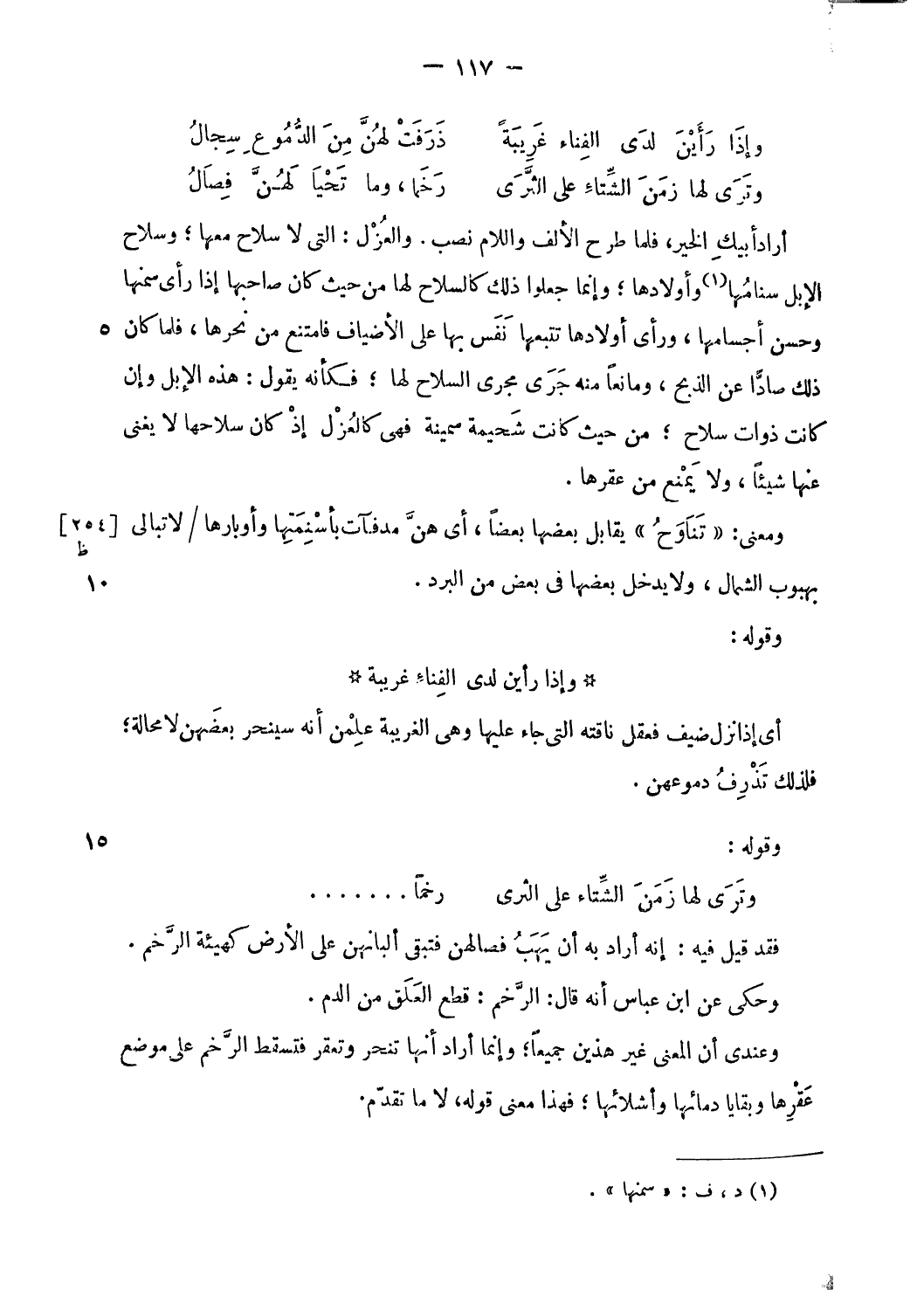 ومعنى: «تناوح» يقابل بعضها بعضا، أى هنّ مدفآت بأسنمتها وأوبارها/ لا تبالى بهبوب الشمال، ولا يدخل بعضها فى بعض من البرد.