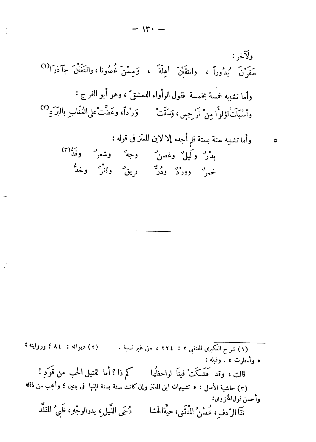 (¬3) حاشية الأصل: «تشبيهات ابن المعتز وإن كانت ستة بستة فإنها فى بيتين؛ وأعجب من ذلك وأحسن قول المخزومى: