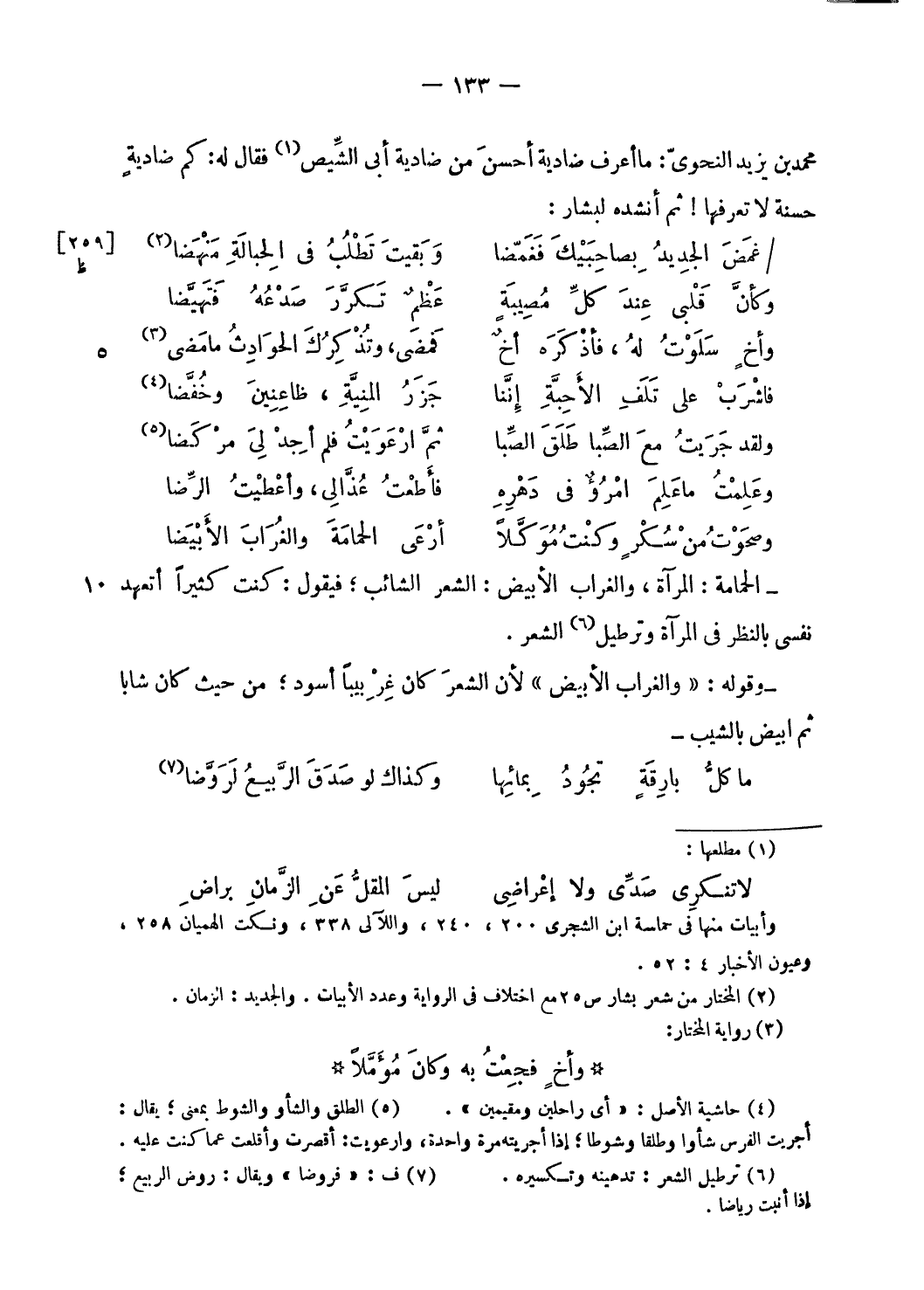 محمد بن يزيد النحوىّ: ما أعرف ضادية أحسن من ضادية أبى الشّيص (¬1) فقال له: كم ضادية حسنة لا تعرفها! ثم أنشده لبشار:
