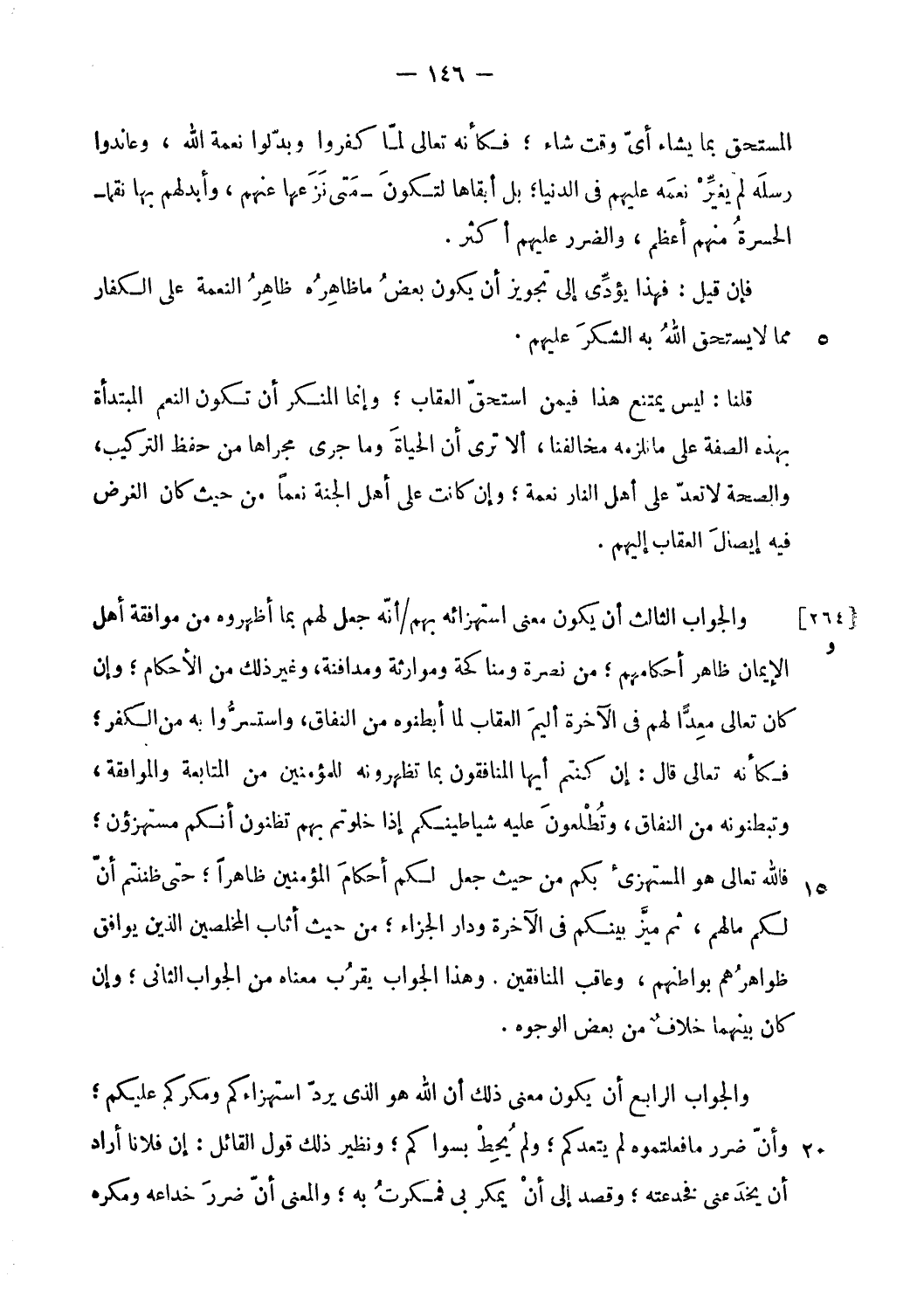 والجواب الرابع أن يكون معنى ذلك أن الله هو الّذي يردّ استهزاءكم ومكركم عليكم؛ وأنّ ضرر ما فعلتموه لم يتعدكم؛ ولم يحط بسواكم؛ ونظير ذلك قول القائل: إن فلانا أراد أن يخدعنى فخدعته؛ وقصد إلى أن يمكر بى فمكرت به؛ والمعنى أنّ ضرر خداعه ومكره