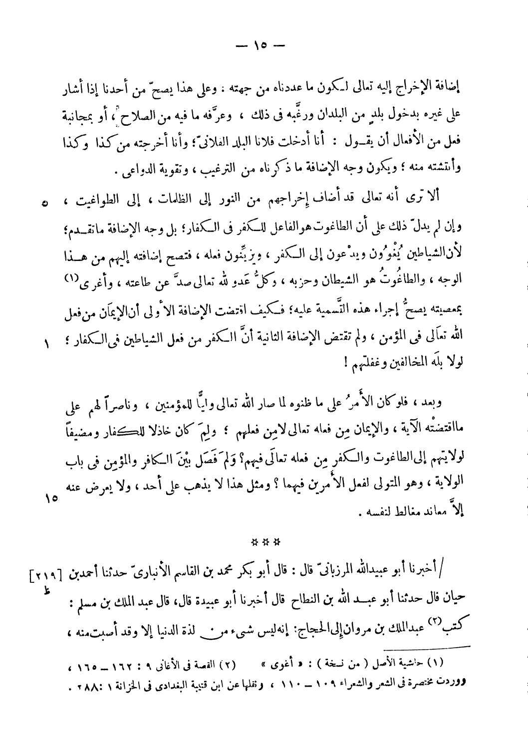 ألا ترى أنه تعالى قد أضاف إخراجهم من النور إلى الظلمات، إلى الطواغيت، وإن لم يدلّ ذلك على أن الطاغوت هو الفاعل للكفر فى الكفار؛ بل وجه الإضافة ما تقدم؛ لأن الشياطين يغوون ويدعون إلى الكفر، ويزيّنون فعله، فتصح إضافته إليهم من هذا الوجه، والطاغوت هو الشيطان وحزبه، وكلّ عدو لله تعالى صدّ عن طاعته، وأغرى (¬1) بمعصيته يصحّ إجراء هذه التّسمية عليه؛ فكيف اقتضت الإضافة الأولى أن الإيمان من فعل الله تعالى فى المؤمن، ولم تقتض الإضافة الثانية أنّ الكفر من فعل الشياطين فى الكفار؛ لولا بله المخالفين وغفلتهم!