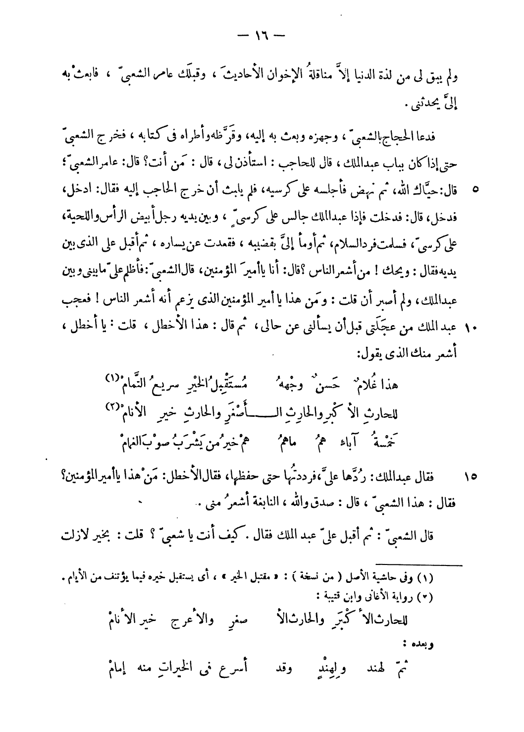 فلم يلبث أن خرج الحاجب إليه فقال: ادخل، فدخل، قال: فدخلت فإذا عبد الملك جالس على كرسىّ، وبين يديه رجل أبيض الرأس واللحية، على كرسىّ، فسلمت فرد السلام، ثم أومأ إلى بقضيبه، فقعدت عن يساره، ثم أقبل على الّذي بين يديه فقال: ويحك! من أشعر الناس؟ قال: أنا يا أمير المؤمنين، قال الشعبىّ: فأظلم عليّ ما بينى وبين عبد الملك، ولم أصبر أن قلت: ومن هذا يا أمير المؤمنين الّذي يزعم أنه أشعر الناس! فعجب عبد الملك من عجلتى قبل أن يسألنى عن حالى، ثم قال: هذا الأخطل، قلت: يا أخطل، أشعر منك الّذي يقول: