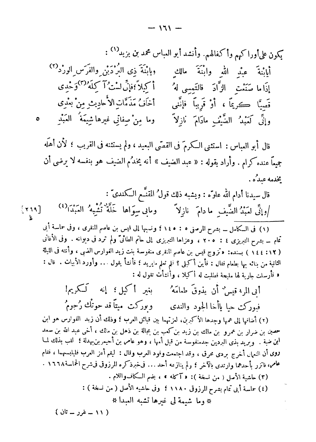 قال أبو العباس: استثنى الكرم فى القصيّ البعيد، ولم يستثنه فى القريب؛ لأن أهله جميعا عنده كرام. وأراد بقوله: «عبد الضيف» أنه يخدم الضيف هو بنفسه لا يرضى أن يخدمه عبده.