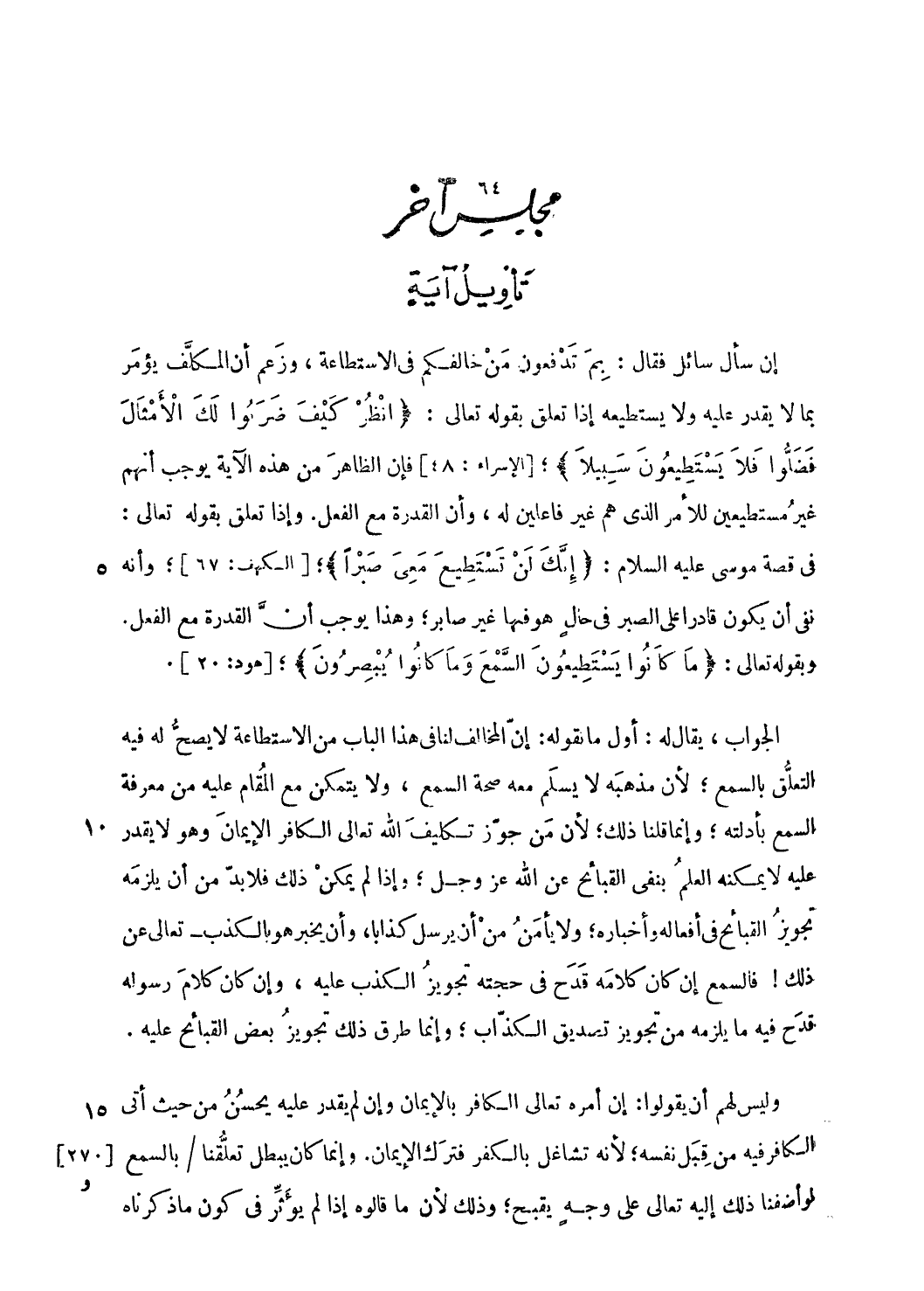 إن سأل سائل فقال: بم تدفعون من خالفكم فى الاستطاعة، وزعم أن المكلّف يؤمر بما لا يقدر عليه ولا يستطيعه إذا تعلق بقوله تعالى: انْظُرْ كَيْفَ ضَرَبُوا لَكَ الْأَمْثالَ فَضَلُّوا فَلا يَسْتَطِيعُونَ سَبِيلًا؛ [الإسراء: 48] فإن الظاهر من هذه الآية يوجب أنهم غير مستطيعين للأمر الّذي هم غير فاعلين له، وأن القدرة مع الفعل. وإذا تعلق بقوله تعالى: