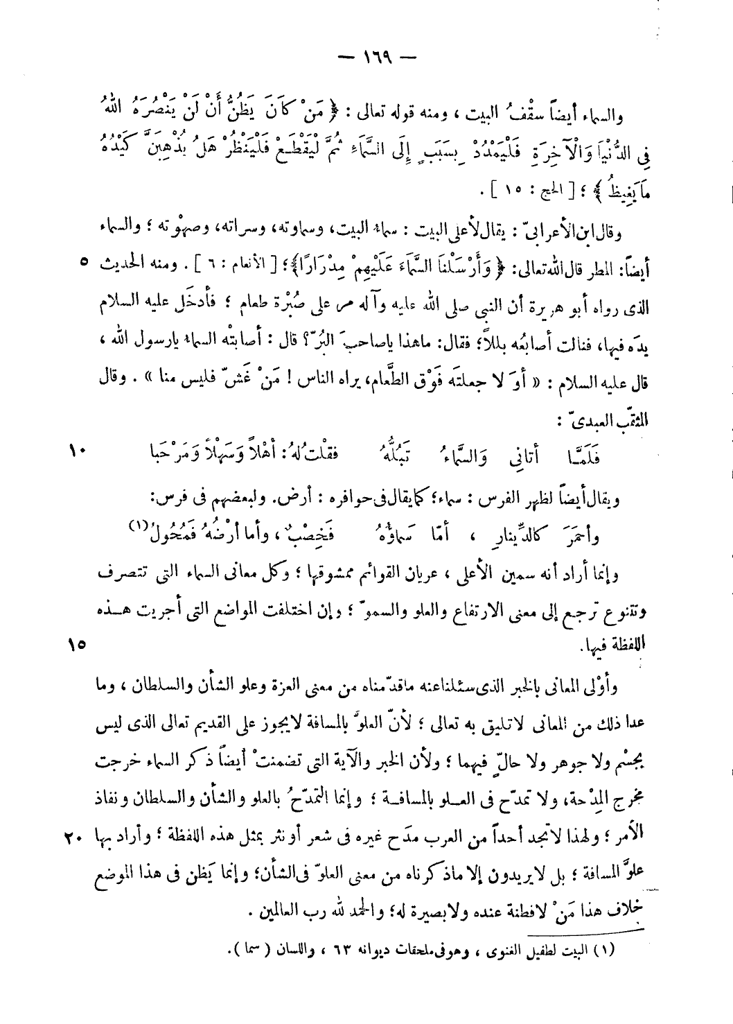 وإنما أراد أنه سمين الأعلى، عريان القوائم ممشوقها؛ وكل معانى السماء التى تتصرف وتتنوع ترجع إلى معنى الارتفاع والعلو والسموّ؛ وإن اختلفت المواضع التى أجريت هذه اللفظة فيها.
