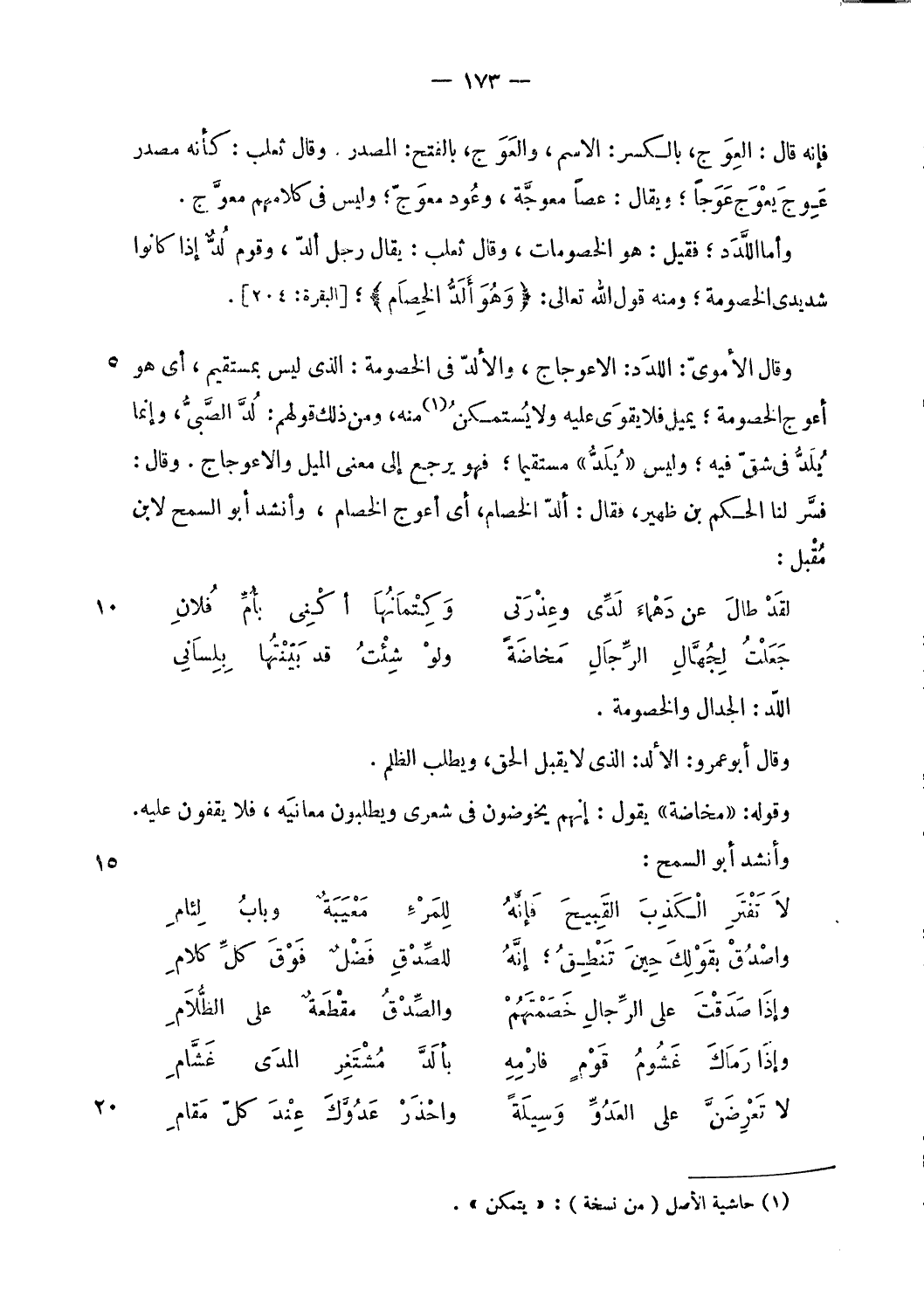 فسّر لنا الحكم بن ظهير، فقال: ألدّ الخصام، أى أعوج الخصام، وأنشد أبو السمح لابن مقبل: