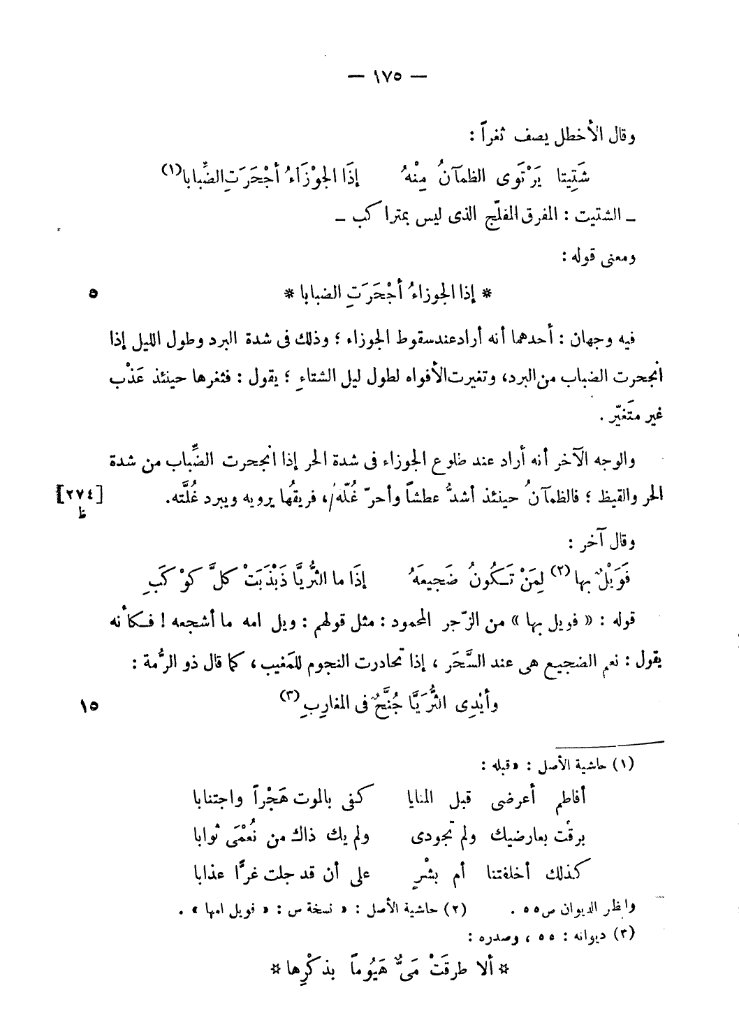 شتيتا يرتوى الظمآن منه … إذا الجوزاء أجحرت الضّبابا (¬1)