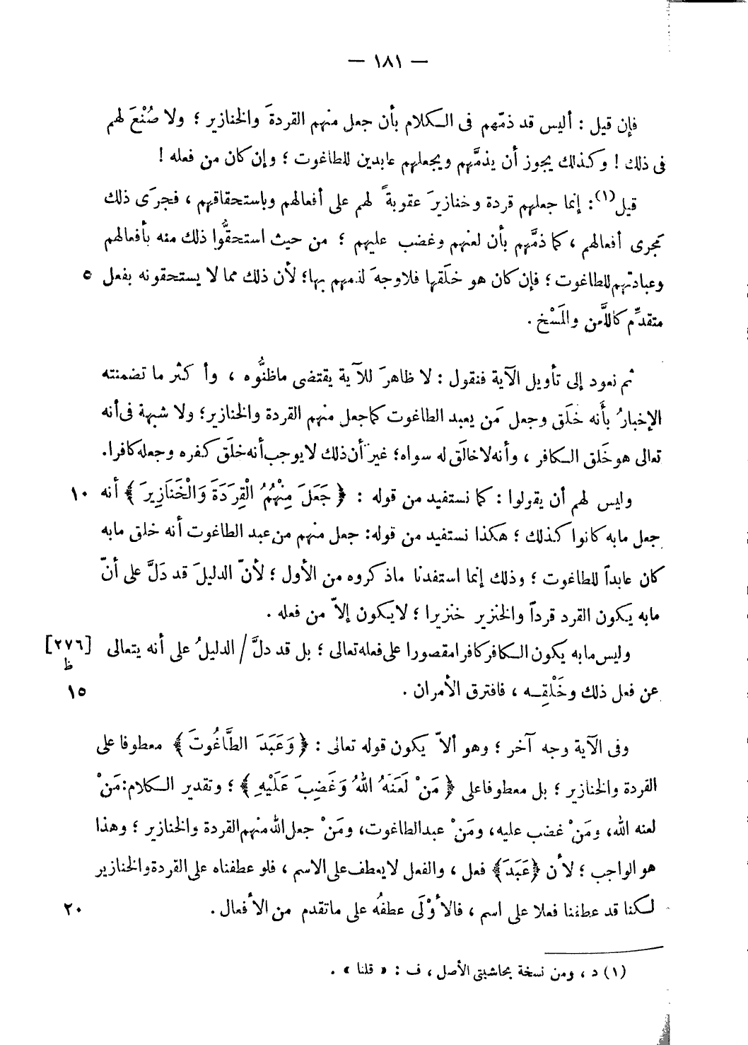 فإن قيل: أليس قد ذمّهم فى الكلام بأن جعل منهم القردة والخنازير؛ ولا صنع لهم فى ذلك! وكذلك يجوز أن يذمّهم ويجعلهم عابدين للطاغوت؛ وإن كان من فعله!