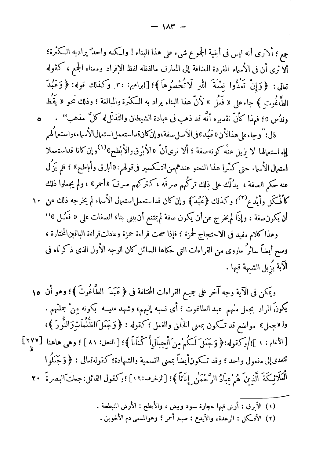 جمع؛ ألا ترى أنه ليس فى أبنية الجموع شيء على هذا البناء! ولكنه واحد يراد به الكثرة؛ ألا ترى أن فى الأسماء المفردة المضافة إلى المعارف ما لفظه لفظ الإفراد ومعناه الجمع، كقوله تعالى: وَإِنْ تَعُدُّوا نِعْمَةَ اللَّهِ لا تُحْصُوها؛ [إبراهيم: 34] وكذلك قوله: وَعَبَدَ الطَّاغُوتَ جاء على «فعل» لأنّ هذا البناء يراد به الكثرة والمبالغة؛ وذلك نحو «يقظ وندس»؛ فهذا كأنّ تقديره أنّه قد ذهب فى عبادة الشيطان والتذلّل له كلّ مذهب".