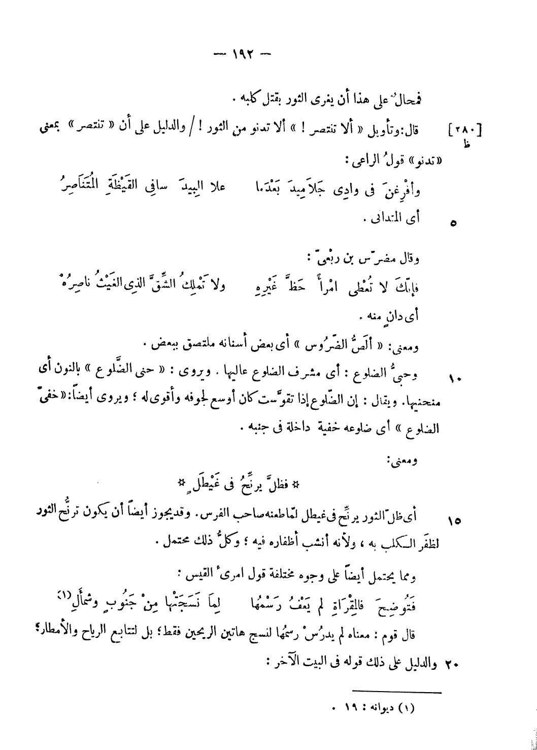 قال: وتأويل «ألا تنتصر! » ألا تدنو من الثور! / والدليل على أن «تنتصر» بمعنى «تدنو» قول الراعى: